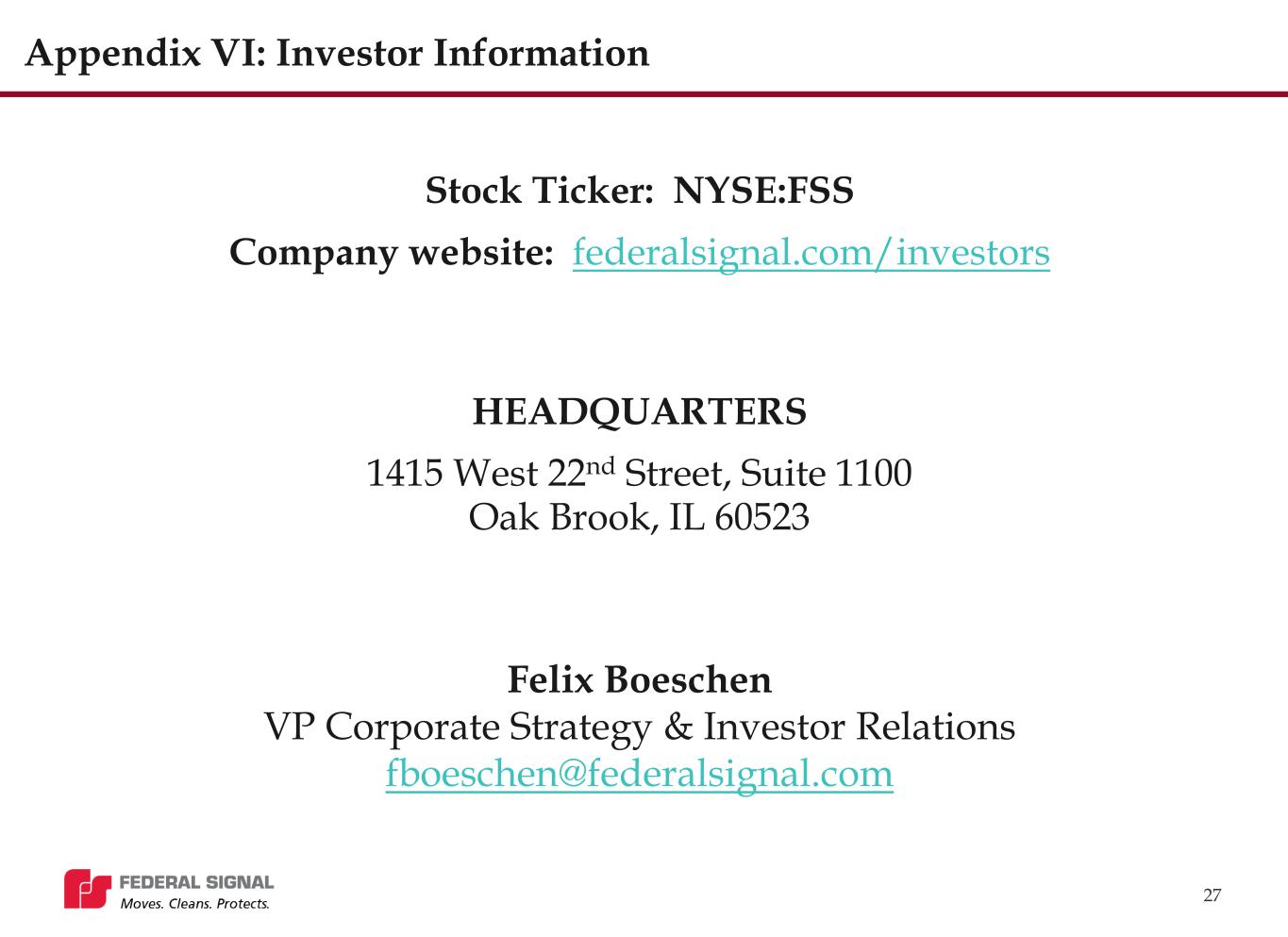 27 Appendix VI: Investor Information Stock Ticker: NYSE:FSS Company website: federalsignal.com/investors HEADQUARTERS 1415 West 22nd Street, Suite 1100 Oak Brook, IL 60523 Felix Boeschen VP Corporate Strategy & Investor Relations fboeschen@federalsignal.com