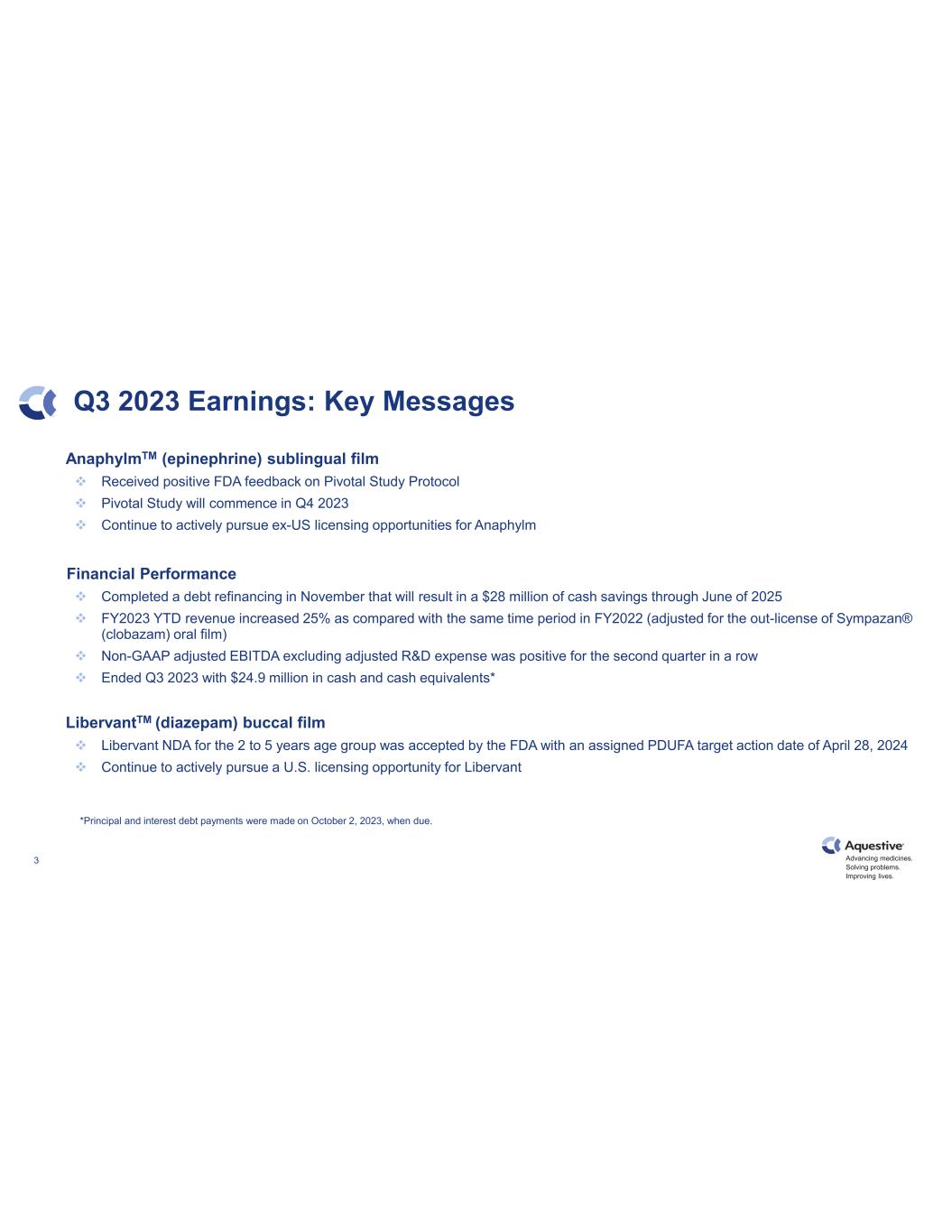 Advancing medicines. Solving problems. Improving lives. 2 ® Disclaimer Certain statements in this presentation include “forward-looking statements” within the meaning of the Private Securities Litigation Reform Act of 1995. Words such as “believe,” “anticipate,” “plan,” “expect,” “estimate,” “intend,” “may,” “will,” or the negative of those terms, and similar expressions, are intended to identify forward-looking statements. These forward-looking statements include, but are not limited to, statements regarding the advancement and related timing of our product candidate Anaphylm™ (epinephrine) Sublingual Film for the emergency treatment of severe allergic reactions, including anaphylaxis through clinical development and approval by the U.S. Food and Drug Administration (FDA), including the filing of pivotal pharmacokinetic (PK) clinical trials and other supporting clinical studies for Anaphylm; regarding the advancement and relating timing through clinical development and approval by the FDA of the Company’s New Drug Application (NDA) for our product candidate Libervant™ (diazepam) Buccal Film with the FDA for the acute treatment of intermittent, stereotypic episodes of frequent seizure activity (i.e., seizure clusters, acute repetitive seizures) that are distinct from a patient’s usual seizure pattern in patients with epilepsy between two and five years of age; regarding the approval for U.S. market access of Libervant for these epilepsy patients aged 12 years and older, and overcoming the orphan drug market exclusivity of an FDA approved nasal spray product of another company extending to January 2027 for this age group of the patient population; regarding the potential for licensing Anaphylm to third parties outside of the U.S.; regarding the potential and related timing for expanding the Company’s manufacturing capabilities and supporting the growth of demand for existing and potential future licensed products in the U.S. and other countries; regarding the 2023 financial outlook of the Company and its growth and future financial and operating results and financial position; and other statements that are not historical facts. These forward-looking statements are subject to the uncertain impact of the COVID-19 global pandemic on the Company’s business including with respect to its clinical trials including site initiation, enrollment and timing and adequacy of clinical trials; on regulatory submissions and regulatory reviews and approval of Anaphylm and Libervant, pharmaceutical ingredient and other raw materials supply chain, manufacture, and distribution; and ongoing availability of an appropriate labor force and skilled professionals. These forward-looking statements are based on the Company’s current expectations and beliefs and are subject to a number of risks and uncertainties that could cause actual results to differ materially from those described in the forward-looking statements. Such risks and uncertainties include, but are not limited to, risks associated with the Company’s development work, including any delays or changes to the timing, cost and success of its product development activities and clinical trials for Anaphylm, Libervant and our other product candidates; risk of the Company’s ability to generate sufficient data in its clinical trials for FDA approval of Anaphylm and Libervant for patients between 2 and 5 years of age; risk of the Company’s ability to address the FDA’s comments on the Company’s pivotal PK study protocol and other concerns identified in the FDA End-of-Phase 2 meeting for Anaphylm; risk that the FDA may require additional clinical studies for approval of Anaphylm and Libervant for patients between 2 and 5 years of age; risk of delays in or the failure to receive FDA approval of Anaphylm and Libervant; risks that the FDA will not approve Libervant for U.S. market access by overcoming the seven year orphan drug market exclusivity of an FDA approved nasal spray product in effect until January 2027, and there can be no assurance that the Company will be successful in obtaining any of the foregoing FDA approvals for Anaphylm and Libervant, including for U.S. market access for Libervant for any age group of patients; risk that a competing pediatric epilepsy product of Libervant will receive FDA approval prior to the Company’s receipt of FDA approval of the Libervant NDA for these epilepsy patients between 2 and 5 years of age; risk relating to the unpredictability of the FDA’s decisions regarding orphan drug exclusivity; risk of litigation brought by third parties relating to overcoming their orphan drug exclusivity of an FDA approved product should the FDA approve Libervant for U.S. market access for any age group of this epilepsy patient population; risk in obtaining market access for Libervant for other reasons; risks associated with the Company’s development work, including any delays or changes to the timing, cost and success of the Company’s product development activities; risk of the success of any competing products; risk inherent in commercializing a new product (including technology risks, financial risks, market risks and implementation risks, and regulatory limitations); risk of the rate and degree of market acceptance of our product candidates, including Anaphylm and Libervant, and our licensed products in the U.S. and abroad; risk of insufficient capital and cash resources, including insufficient access to available debt and equity financing and revenues from operations, to satisfy all of the Company’s short- term and longer term liquidity and cash requirements and other cash needs, at the times and in the amounts needed, including to fund future clinical development activities for Anaphylm, Libervant and our other product candidates; risk that our manufacturing capabilities will be sufficient to support demand for existing and potential future licensed products in the U