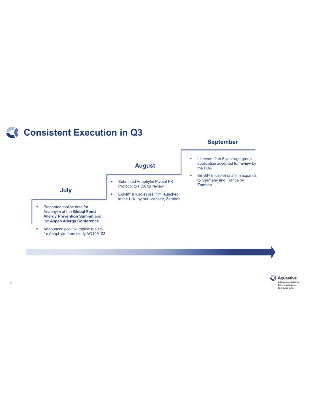 Advancing medicines. Solving problems. Improving lives. 3 Q3 2023 Earnings: Key Messages AnaphylmTM (epinephrine) sublingual film Received positive FDA feedback on Pivotal Study Protocol Pivotal Study will commence in Q4 2023 Continue to actively pursue ex-US licensing opportunities for Anaphylm Financial Performance Completed a debt refinancing in November that will result in a $28 million of cash savings through June of 2025 FY2023 YTD revenue increased 25% as compared with the same time period in FY2022 (adjusted for the out-license of Sympazan® (clobazam) oral film) Non-GAAP adjusted EBITDA excluding adjusted R&D expense was positive for the second quarter in a row Ended Q3 2023 with $24.9 million in cash and cash equivalents* LibervantTM (diazepam) buccal film Libervant NDA for the 2 to 5 years age group was accepted by the FDA with an assigned PDUFA target action date of April 28, 2024 Continue to actively pursue a U.S. licensing opportunity for Libervant *Principal and interest debt payments were made on October 2, 2023, when due.