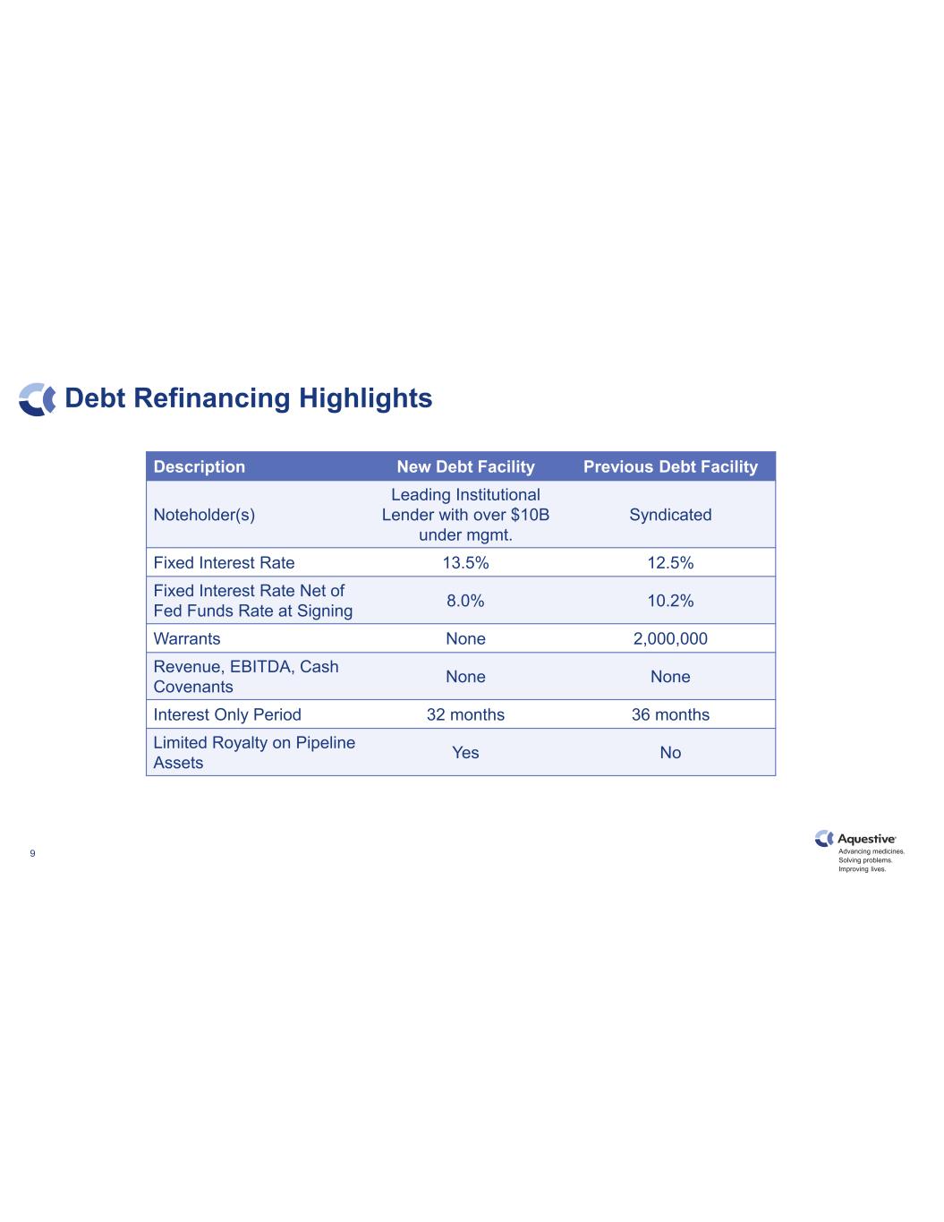 Advancing medicines. Solving problems. Improving lives. Debt Refinancing Highlights 9 Description New Debt Facility Previous Debt Facility Noteholder(s) Leading Institutional Lender with over $10B under mgmt. Syndicated Fixed Interest Rate 13.5% 12.5% Fixed Interest Rate Net of Fed Funds Rate at Signing 8.0% 10.2% Warrants None 2,000,000 Revenue, EBITDA, Cash Covenants None None Interest Only Period 32 months 36 months Limited Royalty on Pipeline Assets Yes No