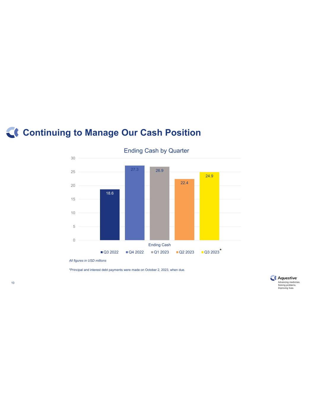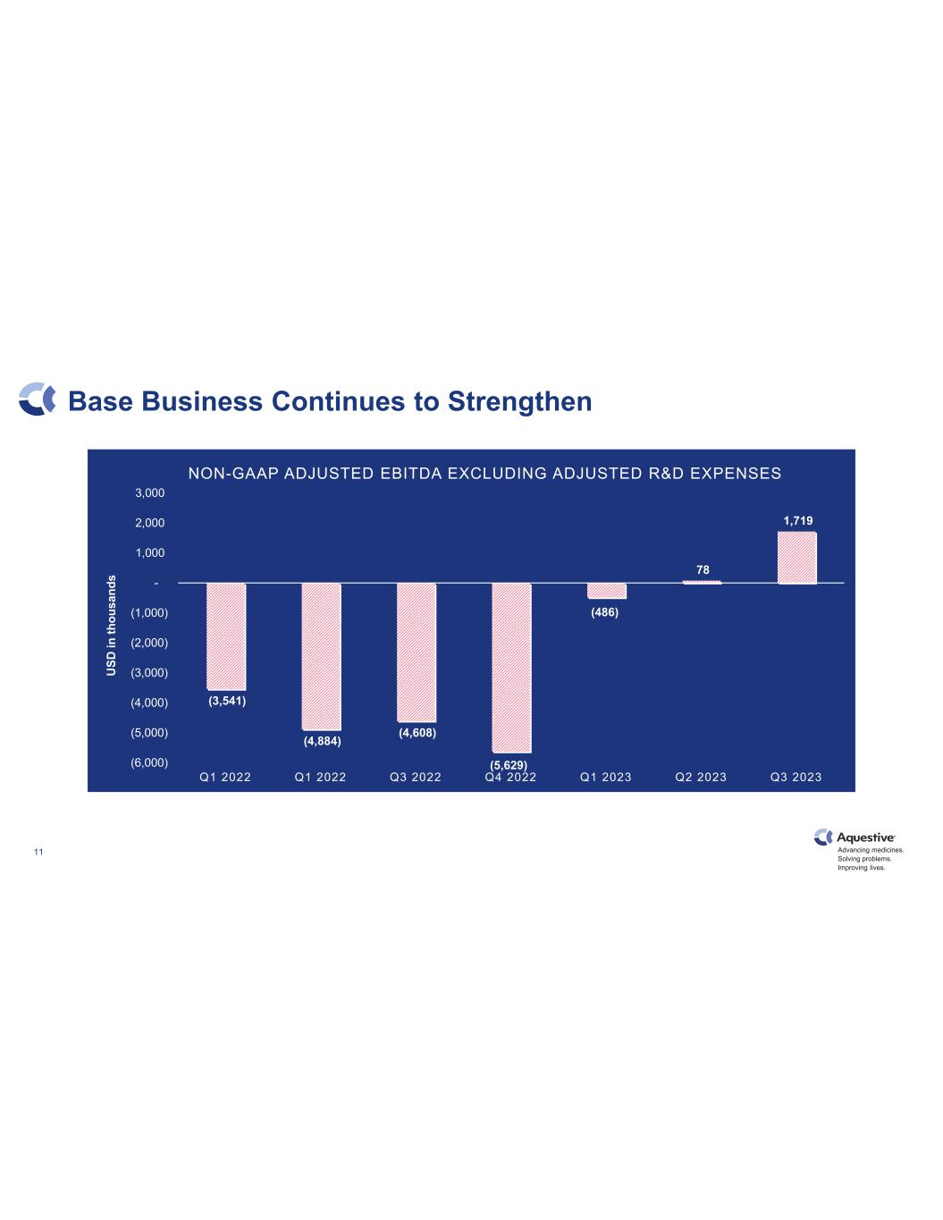 Advancing medicines. Solving problems. Improving lives. 10 Continuing to Manage Our Cash Position 18.6 27.3 26.9 22.4 24.9 0 5 10 15 20 25 30 Ending Cash Ending Cash by Quarter Q3 2022 Q4 2022 Q1 2023 Q2 2023 Q3 2023* All figures in USD millions *Principal and interest debt payments were made on October 2, 2023, when due.