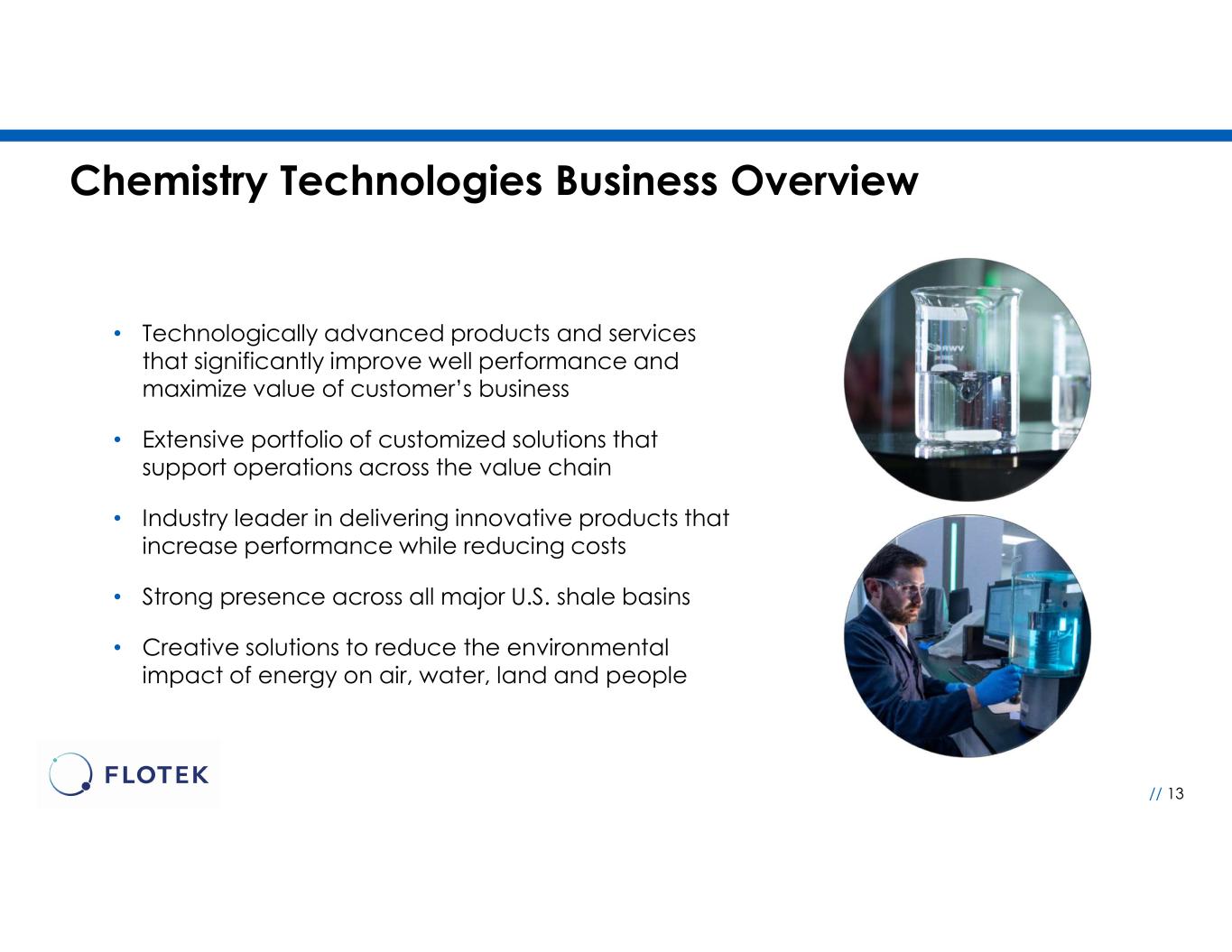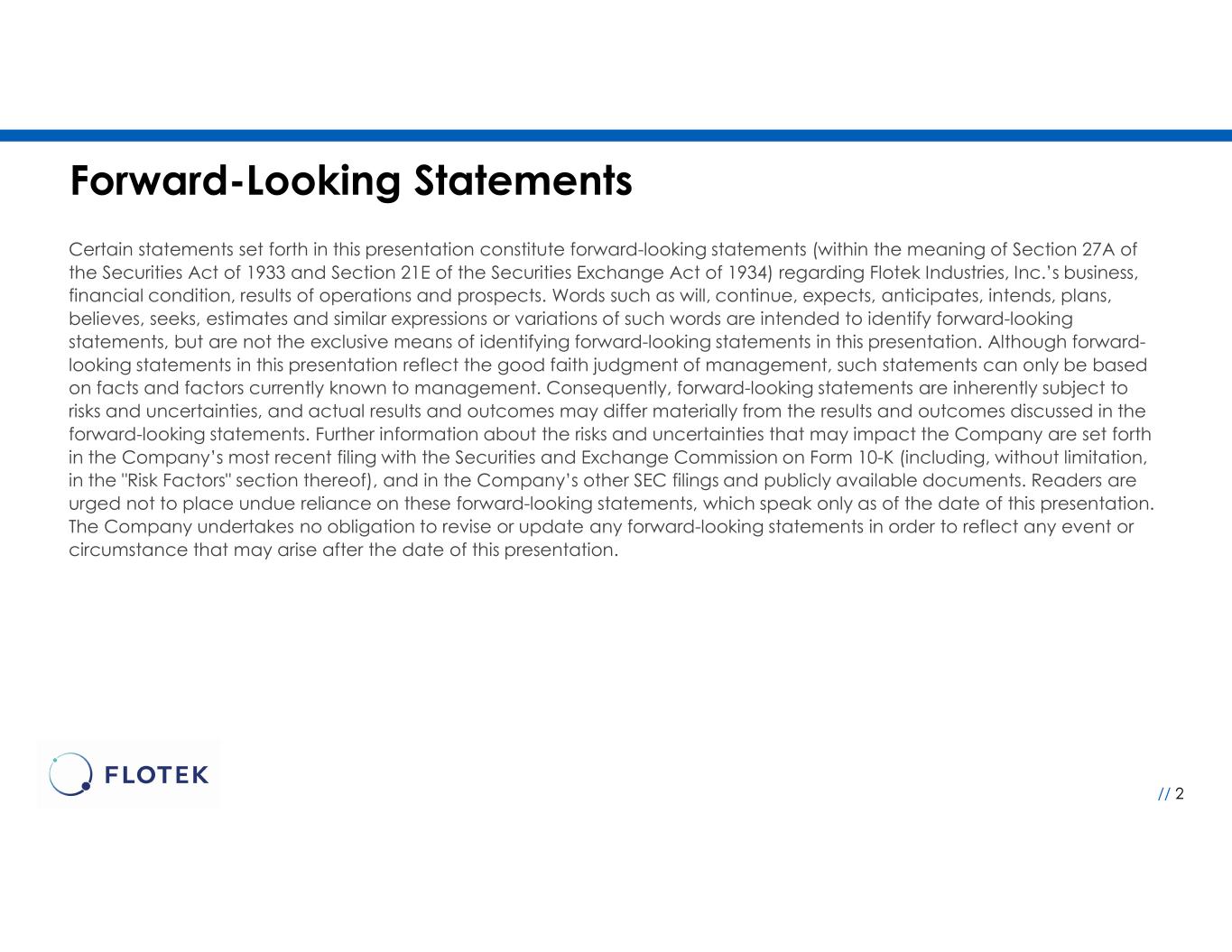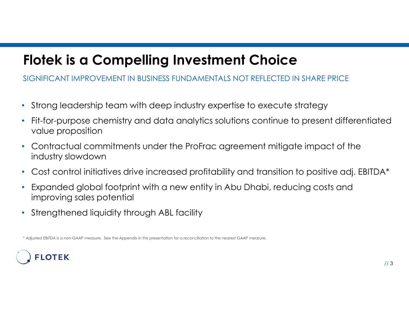 Forward-Looking Statements Certain statements set forth in this presentation constitute forward-looking statements (within the meaning of Section 27A of the Securities Act of 1933 and Section 21E of the Securities Exchange Act of 1934) regarding Flotek Industries, Inc.’s business, financial condition, results of operations and prospects. Words such as will, continue, expects, anticipates, intends, plans, believes, seeks, estimates and similar expressions or variations of such words are intended to identify forward-looking statements, but are not the exclusive means of identifying forward-looking statements in this presentation. Although forward- looking statements in this presentation reflect the good faith judgment of management, such statements can only be based on facts and factors currently known to management. Consequently, forward-looking statements are inherently subject to risks and uncertainties, and actual results and outcomes may differ materially from the results and outcomes discussed in the forward-looking statements. Further information about the risks and uncertainties that may impact the Company are set forth in the Company’s most recent filing with the Securities and Exchange Commission on Form 10-K (including, without limitation, in the "Risk Factors" section thereof), and in the Company’s other SEC filings and publicly available documents. Readers are urged not to place undue reliance on these forward-looking statements, which speak only as of the date of this presentation. The Company undertakes no obligation to revise or update any forward-looking statements in order to reflect any event or circumstance that may arise after the date of this presentation. // 2