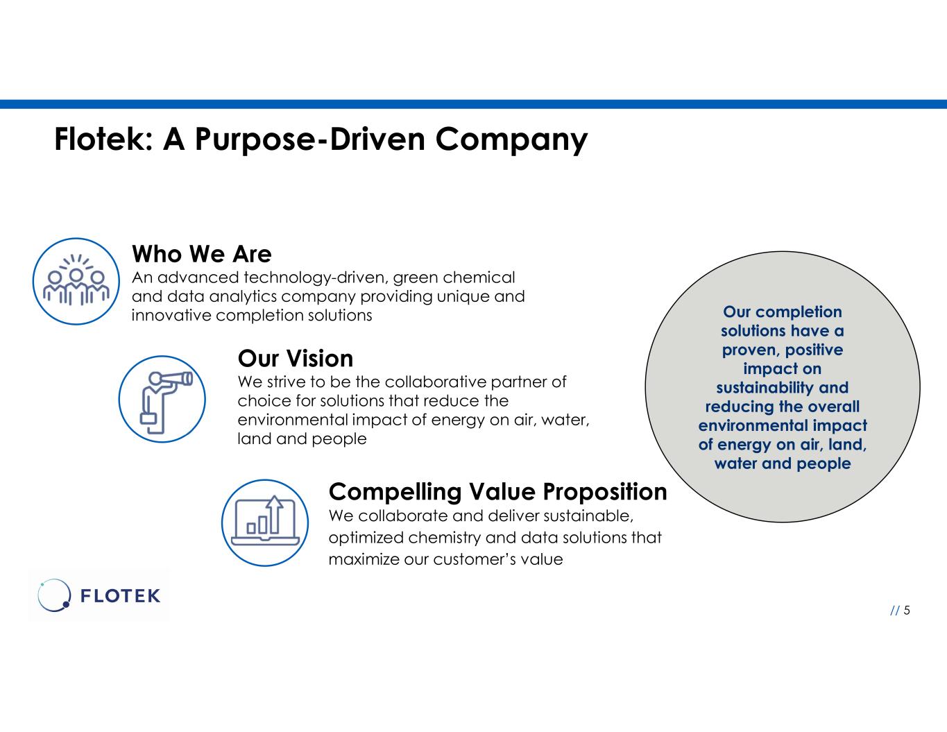 Flotek Industries, Inc. is an advanced technology-driven, green chemical and data analytics company providing unique and innovative completion solutions that have a proven, positive impact on sustainability and reducing the overall environmental impact of energy on air, land, water and people. Flotek has an intellectual property portfolio of over 170 patents and a global presence in more than 15 countries throughout North America, Latin America, the Middle East and North Africa. Flotek has established collaborative partnerships focused on sustainable and optimized chemistry and data solutions which improve well performance and allow its customers to generate higher returns on invested capital.