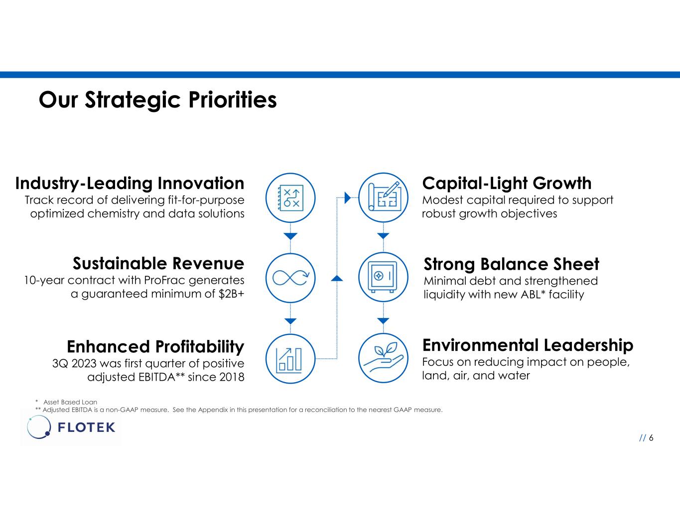 Flotek: A Purpose-Driven Company // 5 Our completion solutions have a proven, positive impact on sustainability and reducing the overall environmental impact of energy on air, land, water and people Who We Are An advanced technology-driven, green chemical and data analytics company providing unique and innovative completion solutions Our Vision We strive to be the collaborative partner of choice for solutions that reduce the environmental impact of energy on air, water, land and people Compelling Value Proposition We collaborate and deliver sustainable, optimized chemistry and data solutions that maximize our customer’s value