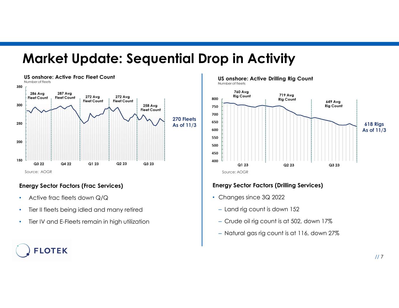 Our Strategic Priorities Industry-Leading Innovation Track record of delivering fit-for-purpose optimized chemistry and data solutions Capital-Light Growth Modest capital required to support robust growth objectives Environmental Leadership Focus on reducing impact on people, land, air, and water // 6 Sustainable Revenue 10-year contract with ProFrac generates a guaranteed minimum of $2B+ Enhanced Profitability 3Q 2023 was first quarter of positive adjusted EBITDA** since 2018 Strong Balance Sheet Minimal debt and strengthened liquidity with new ABL* facility * Asset Based Loan ** Adjusted EBITDA is a non-GAAP measure. See the Appendix in this presentation for a reconciliation to the nearest GAAP measure.