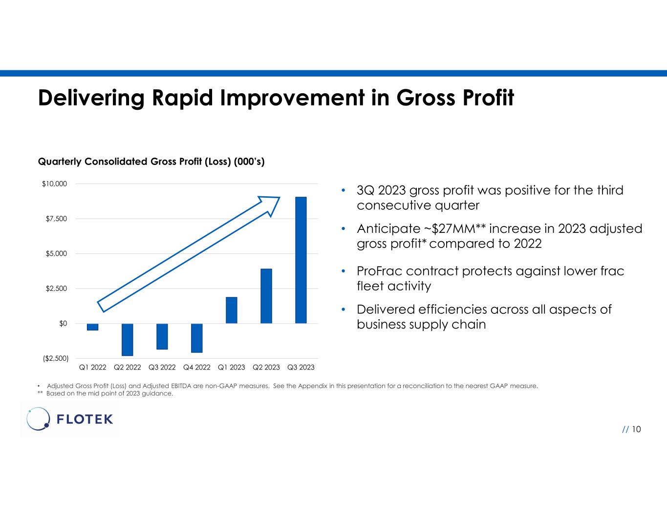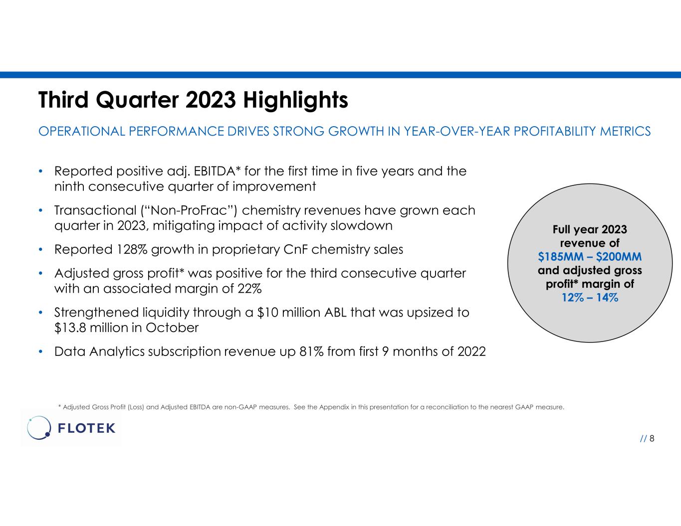 •Adjusted Gross Profit (Non-GAAP)(1): Flotek generated adjusted gross profit of $10.3 million during the third quarter of 2023 compared to adjusted gross profit of $0.2 million for the third quarter of 2022. Adjusted gross profit for the nine months ended September 30, 2023, increased to $18.0 million as compared to a loss of $0.9 million for the nine-month period of 2022. Adjusted gross profit primarily excludes non-cash items, including amortization of contract assets, which reduces both revenue and gross profit.
