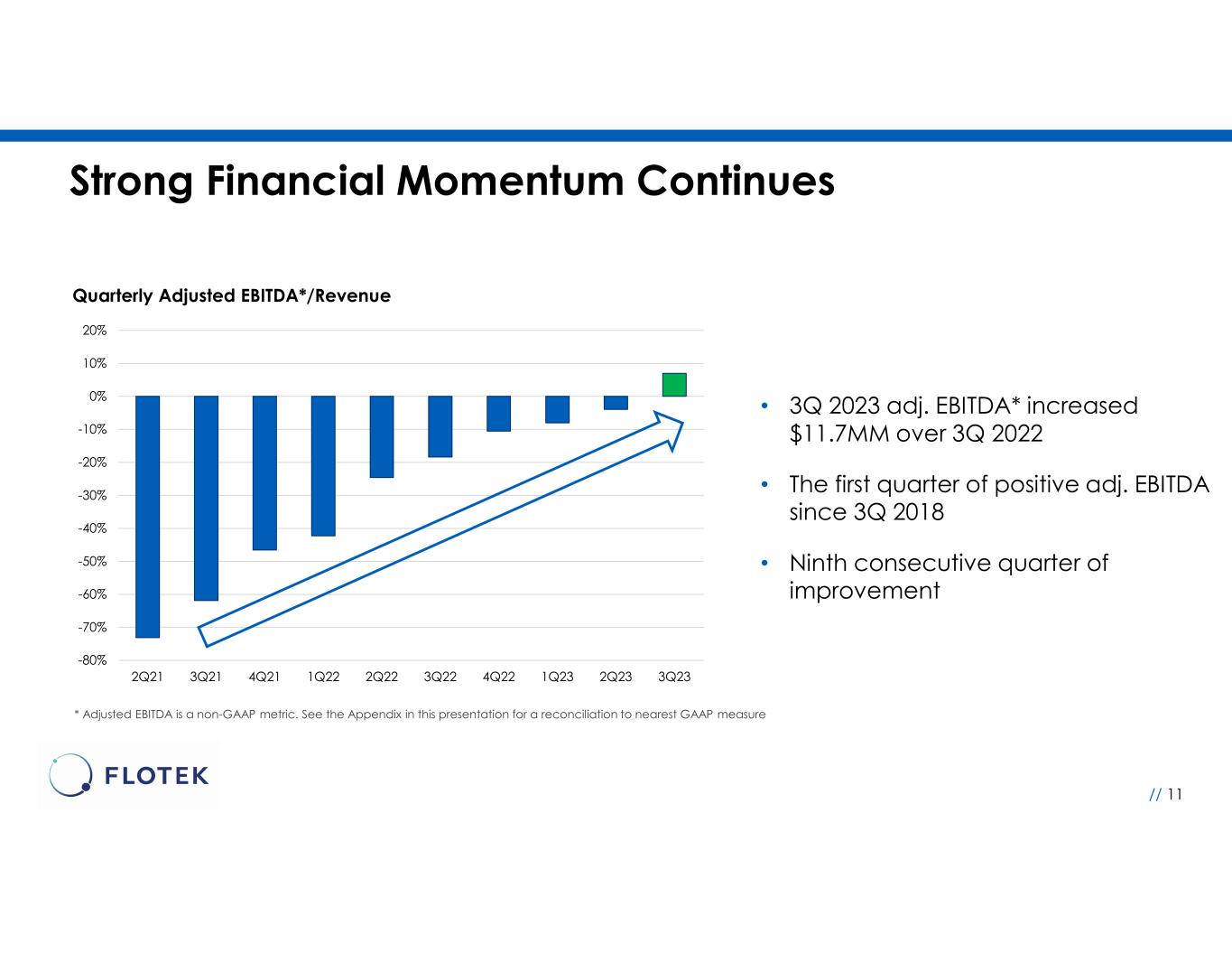 Delivering Rapid Improvement in Gross Profit Quarterly Consolidated Gross Profit (Loss) (000’s) // 10 • 3Q 2023 gross profit was positive for the third consecutive quarter • Anticipate ~$27MM** increase in 2023 adjusted gross profit* compared to 2022 • ProFrac contract protects against lower frac fleet activity • Delivered efficiencies across all aspects of business supply chain ($2,500) $0 $2,500 $5,000 $7,500 $10,000 Q1 2022 Q2 2022 Q3 2022 Q4 2022 Q1 2023 Q2 2023 Q3 2023 • Adjusted Gross Profit (Loss) and Adjusted EBITDA are non-GAAP measures. See the Appendix in this presentation for a reconciliation to the nearest GAAP measure. ** Based on the mid point of 2023 guidance.