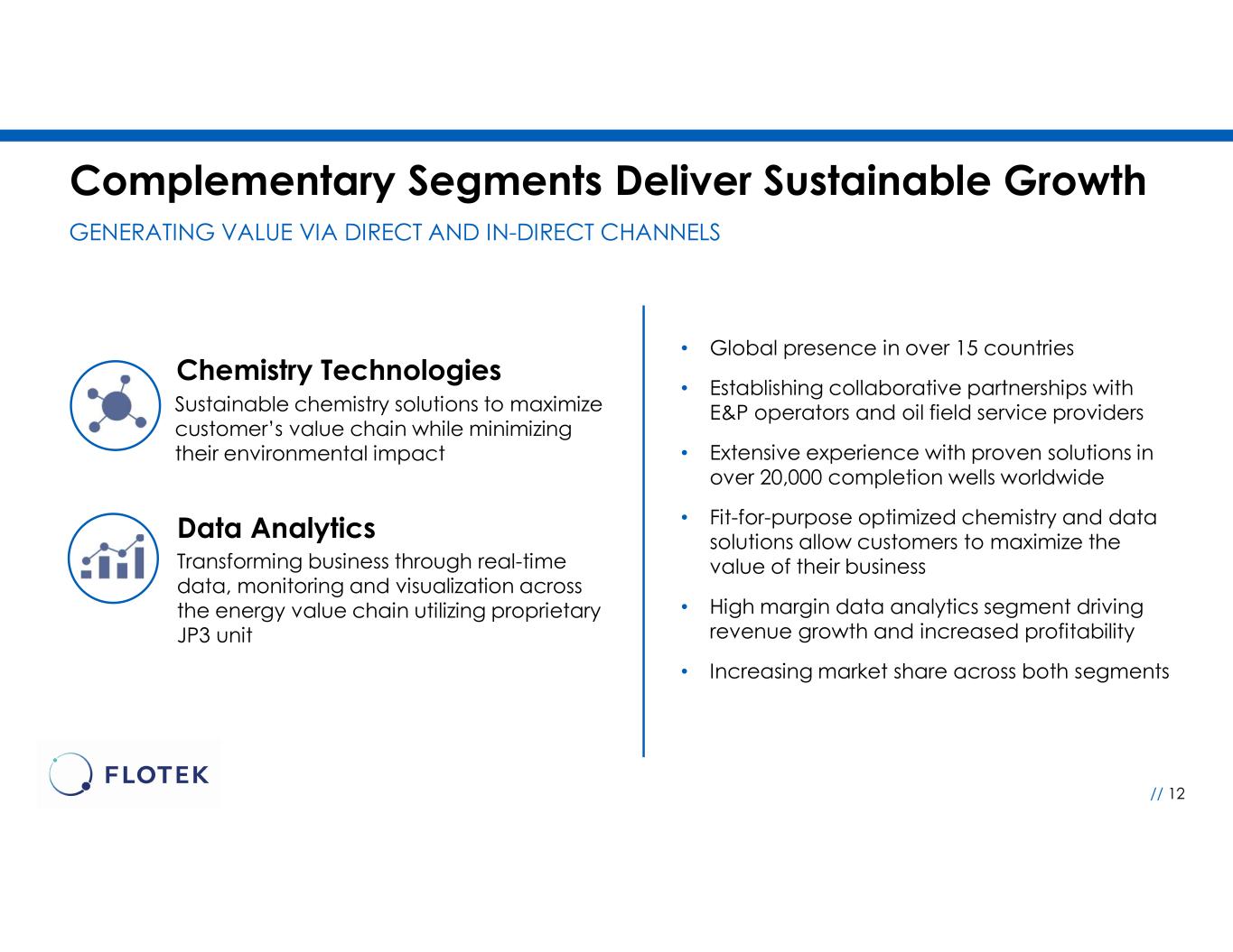 • Global presence in over 15 countries • Establishing collaborative partnerships with E&P operators and oil field service providers • Extensive experience with proven solutions in over 20,000 completion wells worldwide • Fit-for-purpose optimized chemistry and data solutions allow customers to maximize the value of their business • High margin data analytics segment driving revenue growth and increased profitability • Increasing market share across both segments Complementary Segments Deliver Sustainable Growth Sustainable chemistry solutions to maximize customer’s value chain while minimizing their environmental impact Transforming business through real-time data, monitoring and visualization across the energy value chain utilizing proprietary JP3 unit Chemistry Technologies Data Analytics // 12 GENERATING VALUE VIA DIRECT AND IN-DIRECT CHANNELS