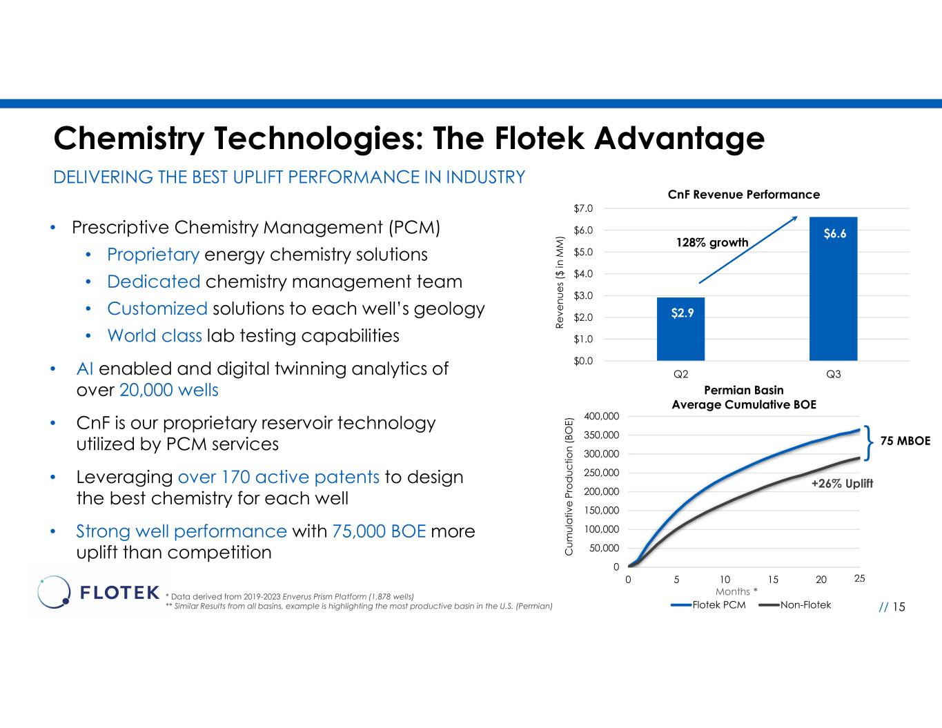 0 50,000 100,000 150,000 200,000 250,000 300,000 350,000 400,000 0 5 10 15 20 C u m u la tiv e P ro d u c tio n (B O E) Months Permian Basin Average Cumulative BOE Flotek PCM Non-Flotek 25 +26% Uplift Chemistry Technologies: The Flotek Advantage // 15 • Prescriptive Chemistry Management (PCM) • Proprietary energy chemistry solutions • Dedicated chemistry management team • Customized solutions to each well’s geology • World class lab testing capabilities • AI enabled and digital twinning analytics of over 20,000 wells • CnF is our proprietary reservoir technology utilized by PCM services • Leveraging over 170 active patents to design the best chemistry for each well • Strong well performance with 75,000 BOE more uplift than competition * Data derived from 2019-2023 Enverus Prism Platform (1,878 wells) ** Similar Results from all basins, example is highlighting the most productive basin in the U.S. (Permian) 75 MBOE} * DELIVERING THE BEST UPLIFT PERFORMANCE IN INDUSTRY $2.9 $6.6 $0.0 $1.0 $2.0 $3.0 $4.0 $5.0 $6.0 $7.0 Q2 Q3 CnF Revenue Performance 128% growth R e ve n u e s ($ in M M )