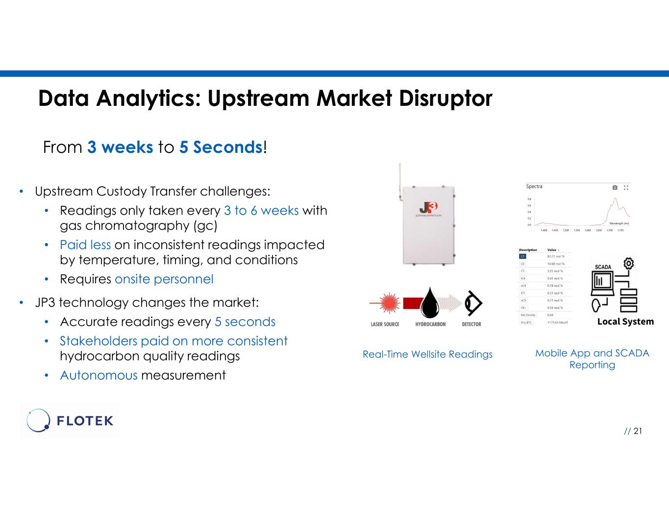 • JP3 field gas monitoring system allows frac fleets and drilling rigs to safely run on field gas displacing more expensive and higher carbon footprint diesel • A three-pad customer case study July - August 2023: • Achieved 70% field gas substitution rate • Eliminated 1.2MM gallons of diesel usage • Realized 100% uptime Data Analytics: Upstream Field Gas Usage // 20 70% Reduction in Diesel/CNG usage Frac Trailer Mounted System