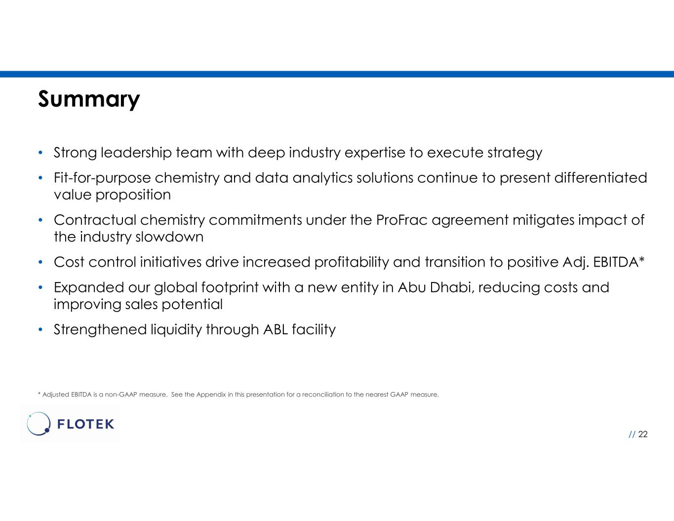 Summary // 22 • Strong leadership team with deep industry expertise to execute strategy • Fit-for-purpose chemistry and data analytics solutions continue to present differentiated value proposition • Contractual chemistry commitments under the ProFrac agreement mitigates impact of the industry slowdown • Cost control initiatives drive increased profitability and transition to positive Adj. EBITDA* • Expanded our global footprint with a new entity in Abu Dhabi, reducing costs and improving sales potential • Strengthened liquidity through ABL facility * Adjusted EBITDA is a non-GAAP measure. See the Appendix in this presentation for a reconciliation to the nearest GAAP measure.