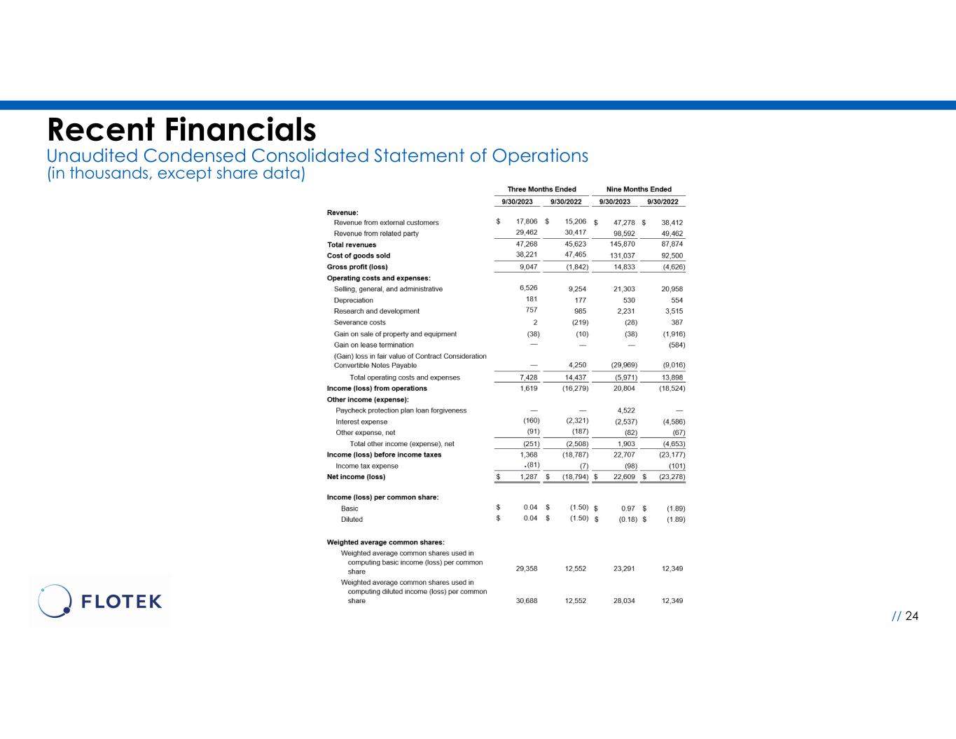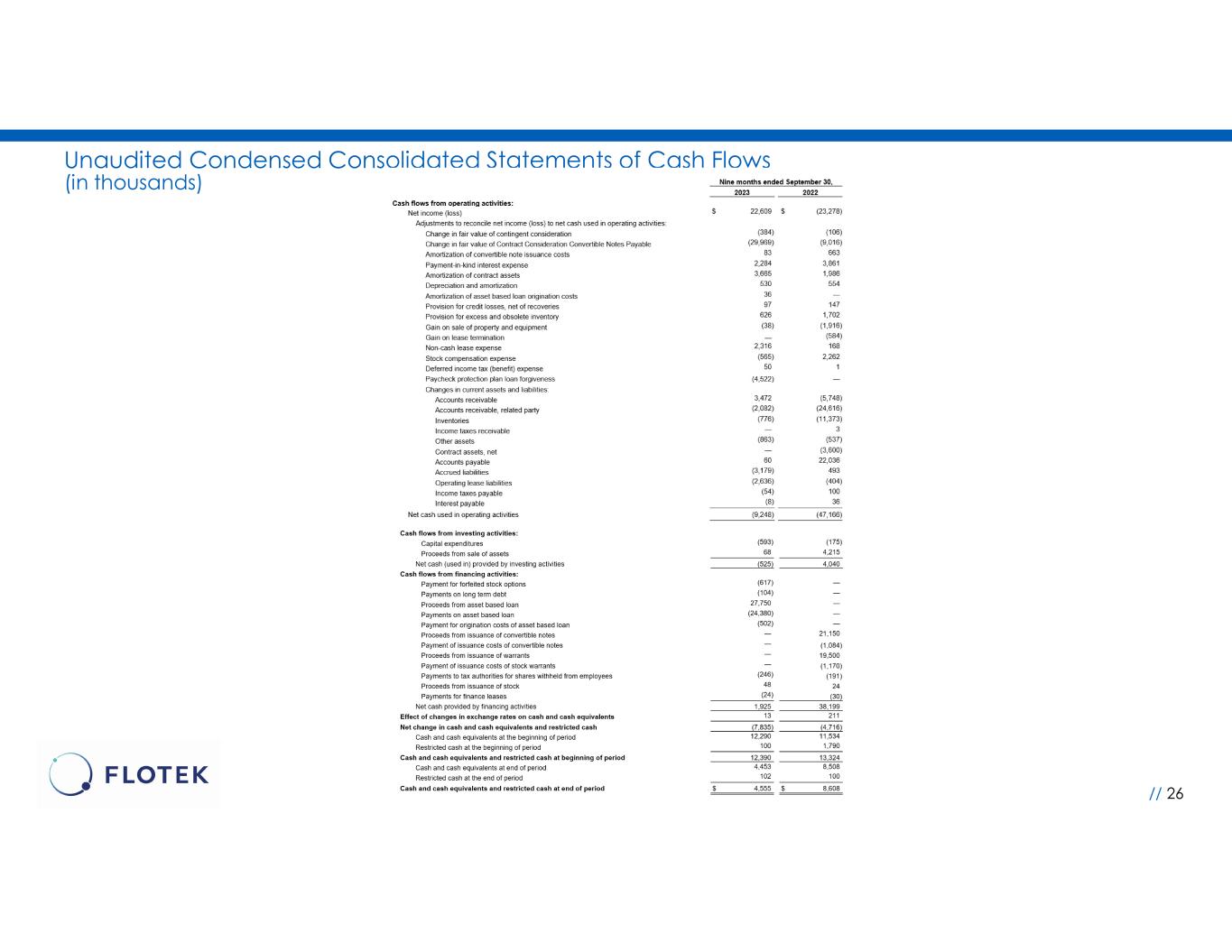•Net Income (Loss) and EPS: Flotek reported net income of $1.3 million, or $0.04 per diluted share, for the third quarter of 2023. This compares to a net loss of $18.8 million, or ($1.50) per diluted share, for the third quarter of 2022. Net income for the nine-month period ended September 30, 2023 was $22.6 million as compared to a net loss of $23.3 million for the comparable period of 2022. Net income/(loss) for the third quarter of 2022 and nine-month periods of 2023 and 2022 included non-cash gains/(losses) on the fair value measurement of convertible notes payable totaling ($4.3) million, $30.0 million, and $9.0 million, respectively.