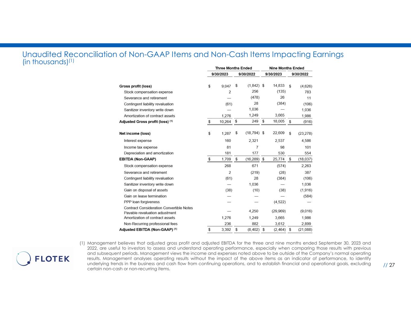 (1) Management believes that adjusted gross profit and adjusted EBITDA for the three and nine months ended September 30, 2023 and 2022, are useful to investors to assess and understand operating performance, especially when comparing those results with previous and subsequent periods. Management views the income and expenses noted above to be outside of the Company’s normal operating results. Management analyses operating results without the impact of the above items as an indicator of performance, to identify underlying trends in the business and cash flow from continuing operations, and to establish financial and operational goals, excluding certain non-cash or non-recurring items.