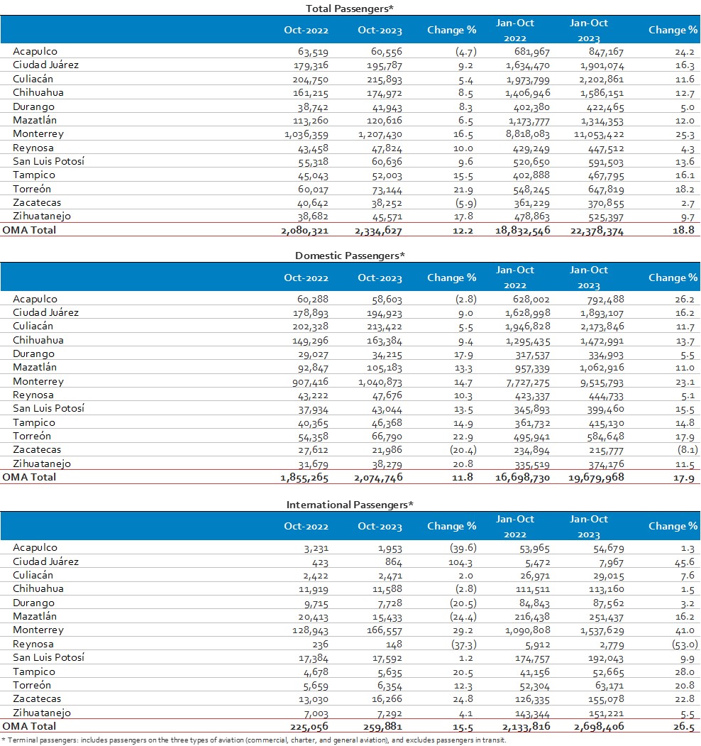 Mexico City, Mexico, November 6, 2023—Mexican airport operator Grupo Aeroportuario del Centro Norte, S.A.B. de C.V., known as OMA (NASDAQ: OMAB; BMV: OMA), reports that terminal passenger traffic at its 13 airports increased 12.2% in October 2023, as compared to October 2022. Domestic traffic increased 11.8%, and international traffic increased 15.5%.