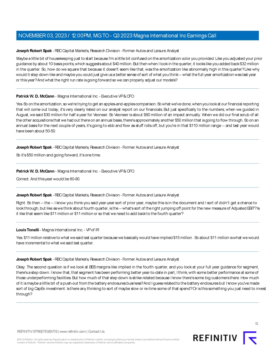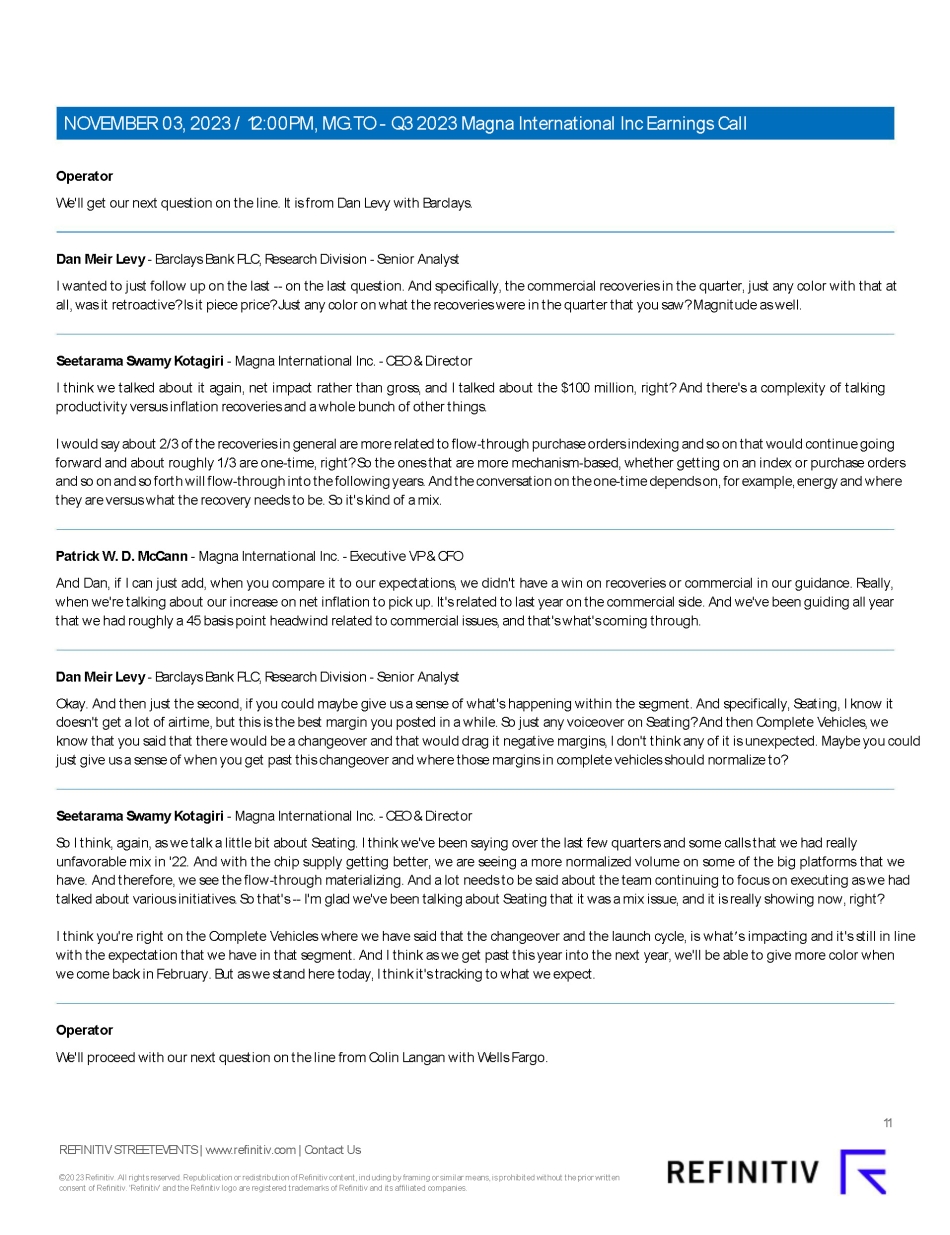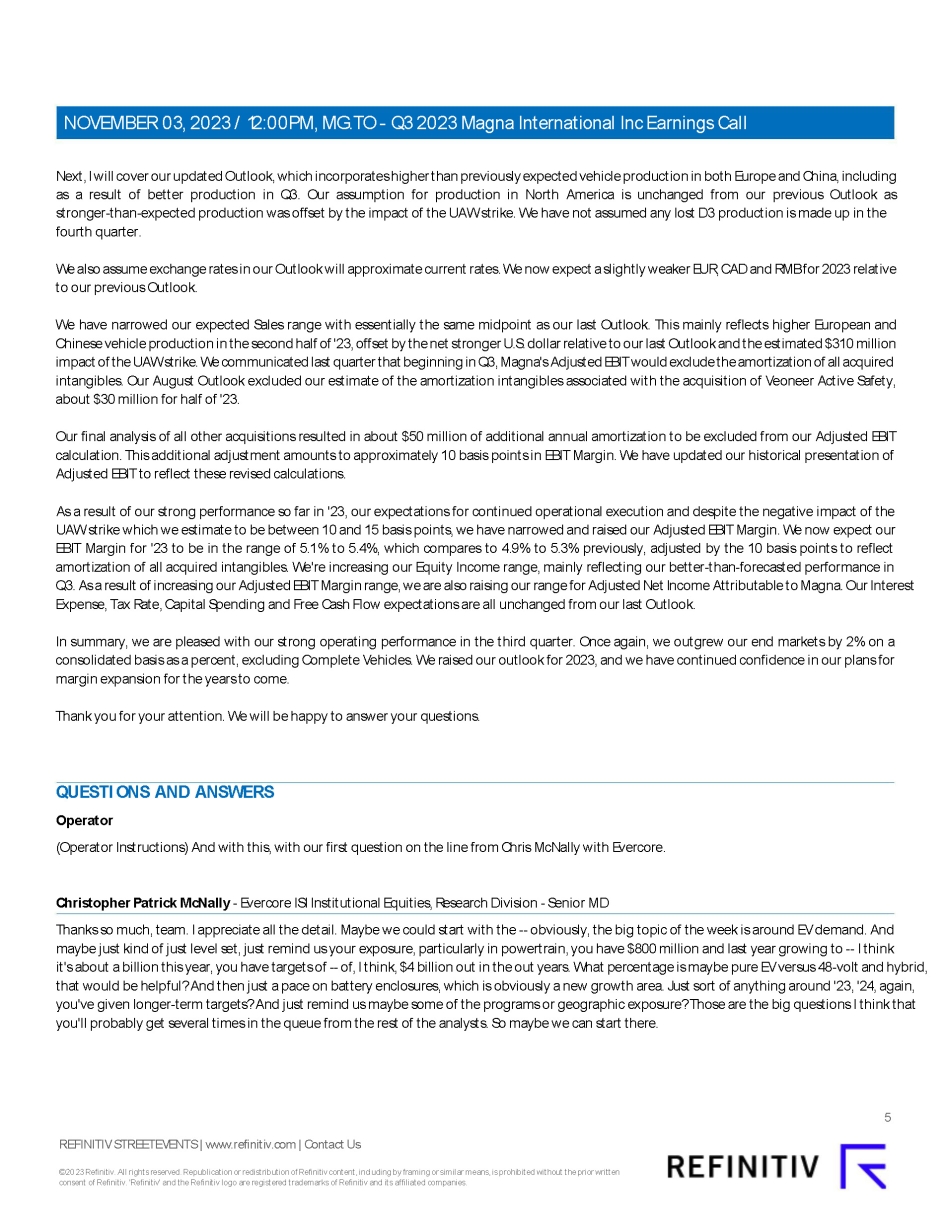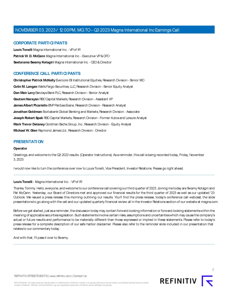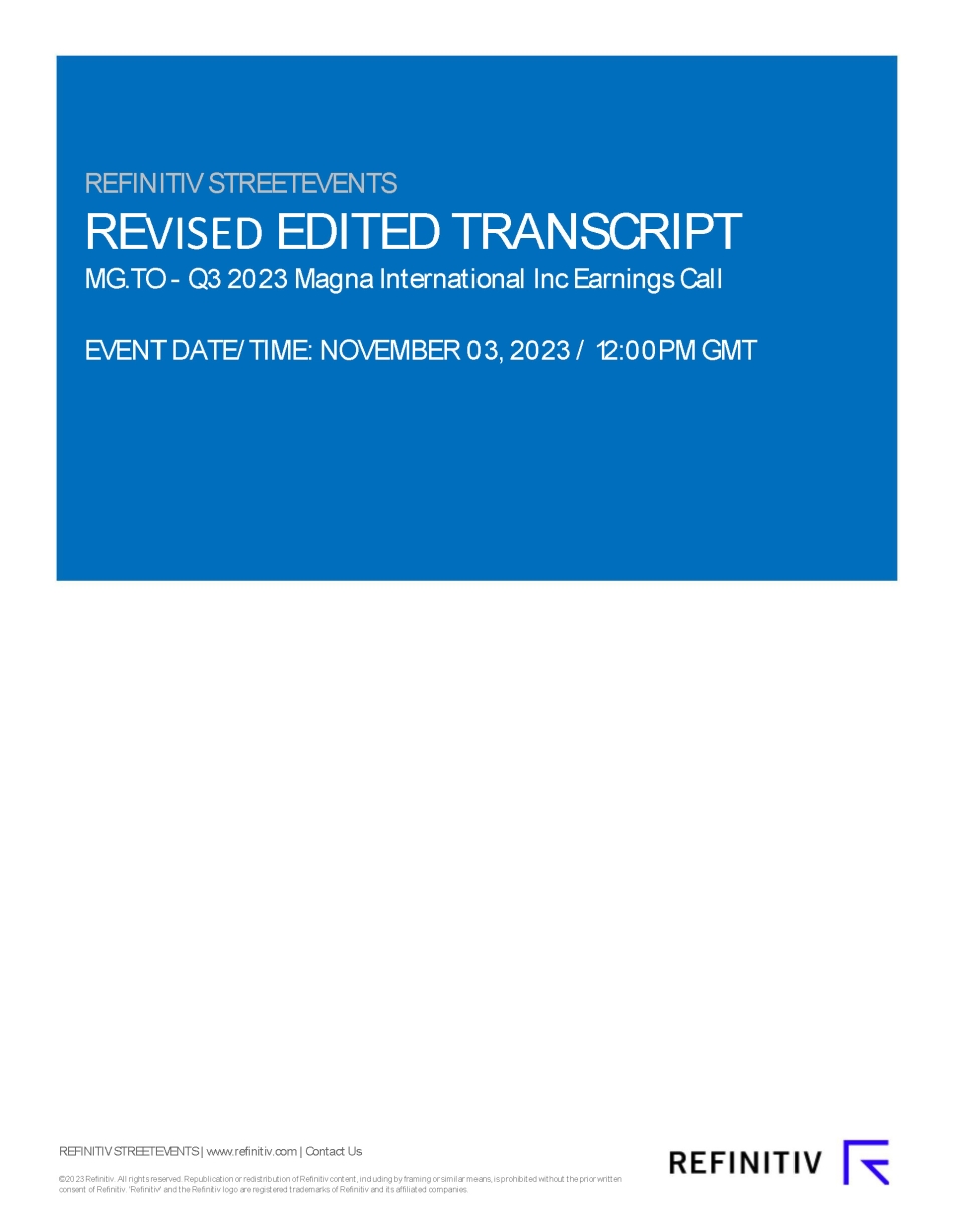 This report on Form 6-K/A amends Exhibit 99.3 Q3 2023 Results Call Transcript (November 3, 2023) of MAGNA INTERNATIONAL INC. (the “Company”)’s report on Form 6-K furnished to the U.S. Securities and Exchange Commission on November 3, 2023 (the “November 3, 2023 6-K”). The revised Exhibit 99.3 is a Revised Edited Transcript which amends and replaces Exhibit 99.3 of the November 3, 2023 6-K. Other than mentioned above, no part of the Form 6-K furnished on November 3, 2023 is being amended.