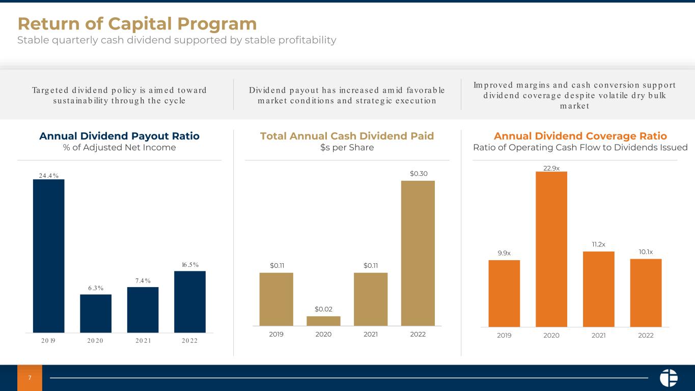 6 Recent Vessel Acquisitions Disciplined acquiror of complementary assets MV Bulk Sachuest - Supramax MV Bulk Courageous - Ultramax MV Bulk Promise - Panamax MV Bulk Valor - Supramax MV Bulk Concord - Panamax MV Nordic Nuluujaak – Post Panamax(1) MV Nordic Qinnqua – Post Panamax(1) MV Nordic Sanngijug – Post Panamax(1) MV Nordic Siku – Post Panamax(1) (1) Vessels are owned through a Joint Venture, of which Pangaea owns 50%. 2021 Purchased 7 vessels for $205 million Purchased 3 vessels for $64 million 2022 & 2023 MV Bulk Prudence - Ultramax