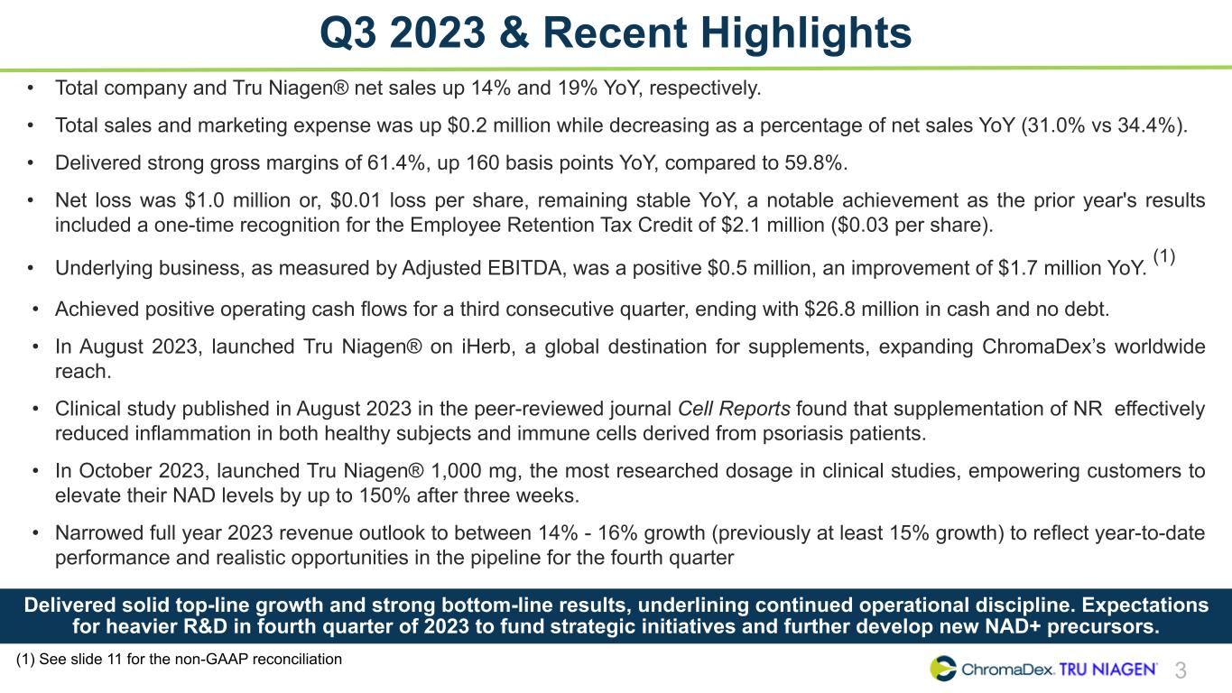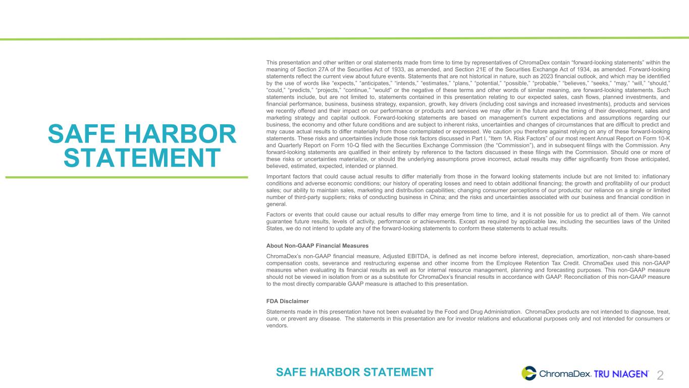 SAFE HARBOR STATEMENT SAFE HARBOR STATEMENT 2 This presentation and other written or oral statements made from time to time by representatives of ChromaDex contain “forward-looking statements” within the meaning of Section 27A of the Securities Act of 1933, as amended, and Section 21E of the Securities Exchange Act of 1934, as amended. Forward-looking statements reflect the current view about future events. Statements that are not historical in nature, such as 2023 financial outlook, and which may be identified by the use of words like “expects,” “anticipates,” “intends,” “estimates,” “plans,” “potential,” “possible,” “probable,” “believes,” “seeks,” “may,” “will,” “should,” “could,” “predicts,” “projects,” “continue,” “would” or the negative of these terms and other words of similar meaning, are forward-looking statements. Such statements include, but are not limited to, statements contained in this presentation relating to our expected sales, cash flows, planned investments, and financial performance, business, business strategy, expansion, growth, key drivers (including cost savings and increased investments), products and services we recently offered and their impact on our performance or products and services we may offer in the future and the timing of their development, sales and marketing strategy and capital outlook. Forward-looking statements are based on management’s current expectations and assumptions regarding our business, the economy and other future conditions and are subject to inherent risks, uncertainties and changes of circumstances that are difficult to predict and may cause actual results to differ materially from those contemplated or expressed. We caution you therefore against relying on any of these forward-looking statements. These risks and uncertainties include those risk factors discussed in Part I, “Item 1A. Risk Factors” of our most recent Annual Report on Form 10-K and Quarterly Report on Form 10-Q filed with the Securities Exchange Commission (the “Commission”), and in subsequent filings with the Commission. Any forward-looking statements are qualified in their entirety by reference to the factors discussed in these filings with the Commission. Should one or more of these risks or uncertainties materialize, or should the underlying assumptions prove incorrect, actual results may differ significantly from those anticipated, believed, estimated, expected, intended or planned. Important factors that could cause actual results to differ materially from those in the forward looking statements include but are not limited to: inflationary conditions and adverse economic conditions; our history of operating losses and need to obtain additional financing; the growth and profitability of our product sales; our ability to maintain sales, marketing and distribution capabilities; changing consumer perceptions of our products; our reliance on a single or limited number of third-party suppliers; risks of conducting business in China; and the risks and uncertainties associated with our business and financial condition in general. Factors or events that could cause our actual results to differ may emerge from time to time, and it is not possible for us to predict all of them. We cannot guarantee future results, levels of activity, performance or achievements. Except as required by applicable law, including the securities laws of the United States, we do not intend to update any of the forward-looking statements to conform these statements to actual results. About Non-GAAP Financial Measures ChromaDex’s non-GAAP financial measure, Adjusted EBITDA, is defined as net income before interest, depreciation, amortization, non-cash share-based compensation costs, severance and restructuring expense and other income from the Employee Retention Tax Credit. ChromaDex used this non-GAAP measures when evaluating its financial results as well as for internal resource management, planning and forecasting purposes. This non-GAAP measure should not be viewed in isolation from or as a substitute for ChromaDex’s financial results in accordance with GAAP. Reconciliation of this non-GAAP measure to the most directly comparable GAAP measure is attached to this presentation. FDA Disclaimer Statements made in this presentation have not been evaluated by the Food and Drug Administration. ChromaDex products are not intended to diagnose, treat, cure, or prevent any disease. The statements in this presentation are for investor relations and educational purposes only and not intended for consumers or vendors.