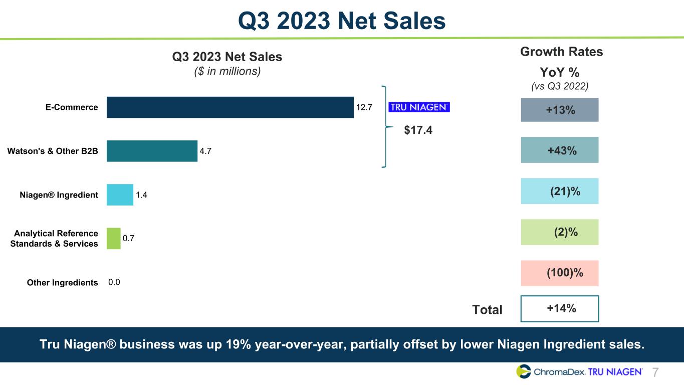 ChromaDex reported a net sales increase of 14%, or $2.4 million, to $19.5 million. The increase in total net sales was driven by growth in Tru Niagen® sales, partially offset by lower Niagen® ingredient sales.