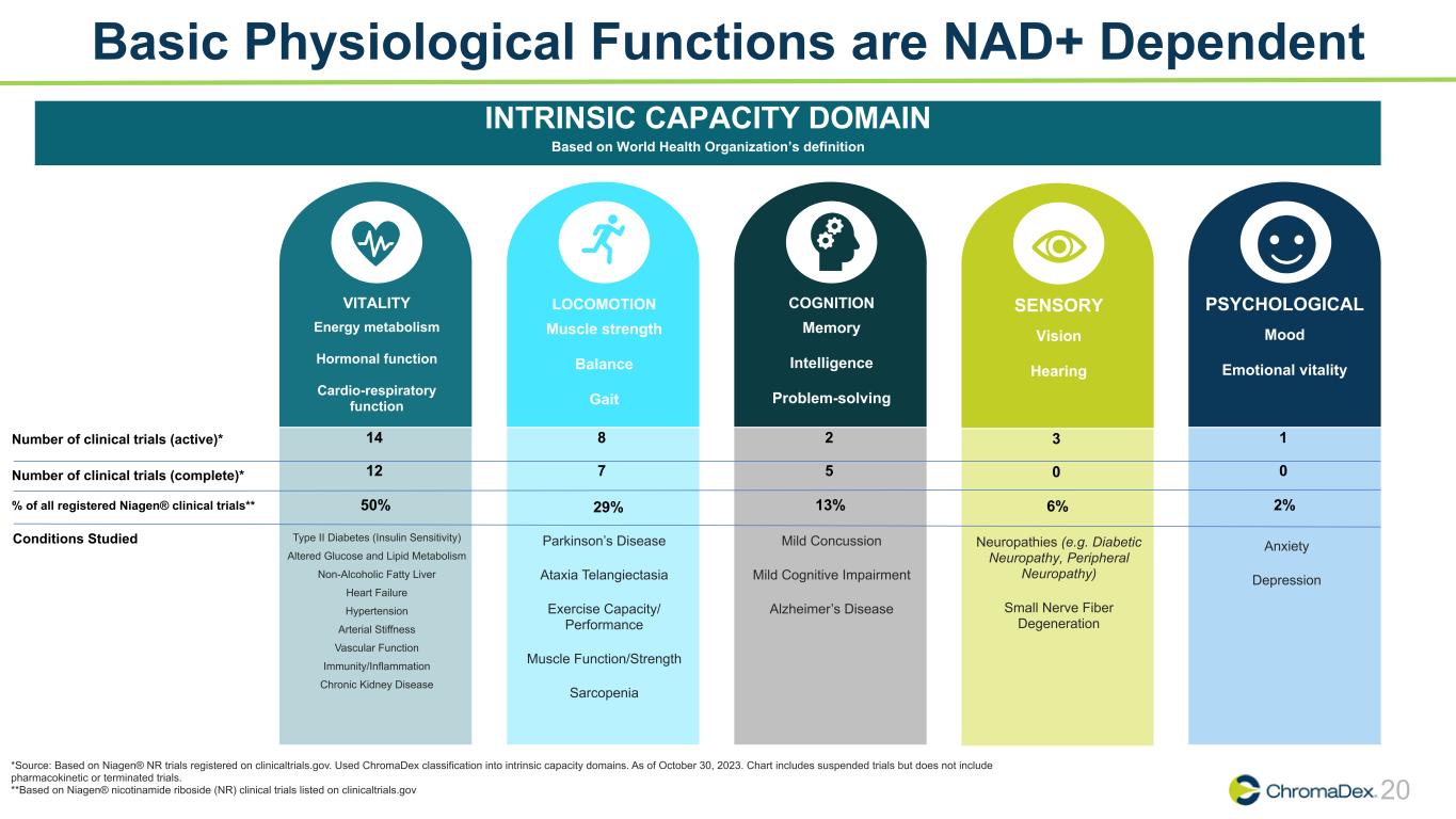 ChromaDex Corporation is a global bioscience company dedicated to healthy aging. The ChromaDex team, which includes world-renowned scientists, is pioneering research on nicotinamide adenine dinucleotide (NAD+), an essential coenzyme that is a key regulator of cellular metabolism and is found in every cell of the human body. NAD+ levels in humans have been shown to decline with age, among other factors, and may be increased through supplementation with NAD+ precursors. ChromaDex is the innovator behind the NAD+ precursor nicotinamide riboside (NR), commercialized as the flagship ingredient Niagen®. Nicotinamide riboside and other NAD+ precursors are protected by ChromaDex’s patent portfolio.