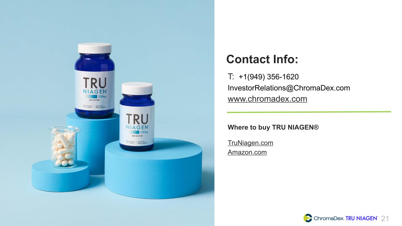 The information contained in this documents is confidential, privileged and only for the information of the intended recipient and may not be used, published or redistributed without the prior written consent (2019) Contact Info: T: +1(949) 356-1620 InvestorRelations@ChromaDex.com www.chromadex.com Where to buy TRU NIAGEN® TruNiagen.com Amazon.com 21