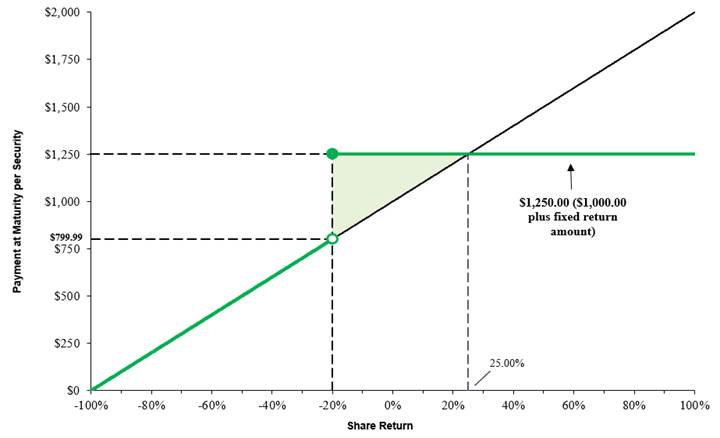 Because the underlying shares appreciated from the hypothetical initial share price to the hypothetical final share price, your payment at maturity in this scenario would be equal to the $1,000 stated principal amount per security plus the fixed return amount, or $1,250.00 per security. In this scenario, the fixed return percentage is less than the appreciation of the underlying shares, and as a result an investment in the securities would underperform a hypothetical alternative investment providing 1-to-1 exposure to the appreciation of the underlying shares without a fixed return.