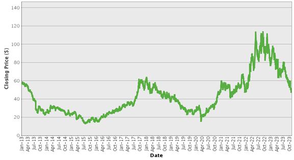 | Sociedad Quimica y Minera de Chile S.A. – Historical Closing Prices January 2, 2013 to November 6, 2023 |