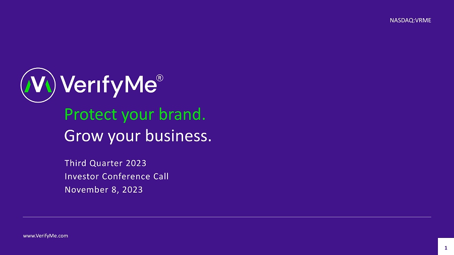 Protect your brand. Grow your business. Third Quarter 2023 Investor Conference Call November 8, 2023 www.VerifyMe.com NASDAQ:VRME 1