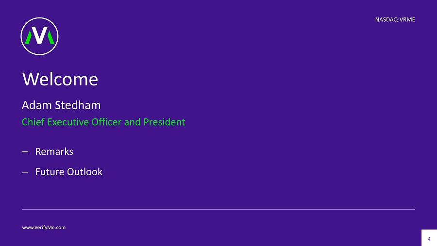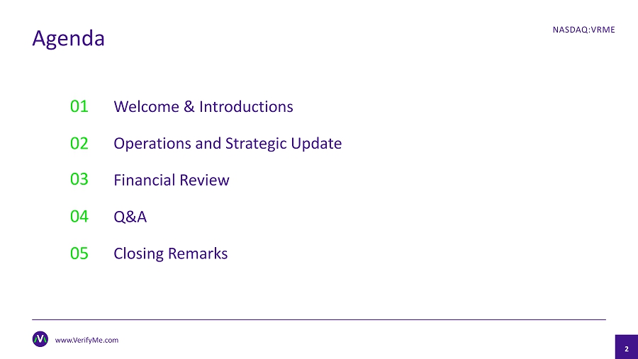 Agenda NASDAQ:VRME 01 Welcome & Introductions Operations and Strategic Update Financial Review Q&A Closing Remarks 02 03 www.VerifyMe.com 04 05 2