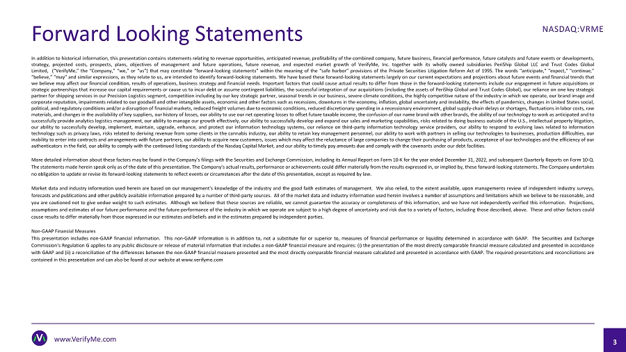 Forward Looking Statements In addition to historical information, this presentation contains statements relating to revenue opportunities, anticipated revenue, profitability of the combined company, future business, financial performance, future catalysts and future events or developments, strategy, projected costs, prospects, plans, objectives of management and future operations, future revenue, and expected market growth of VerifyMe , Inc . together with its wholly owned subsidiaries PeriShip Global LLC and Trust Codes Global Limited, (“ VerifyMe ,” the “Company,” “we,” or “us”) that may constitute “forward - looking statements” within the meaning of the “safe harbor” provisions of the Private Securities Litigation Reform Act of 1995 . The words "anticipate," "expect," "continue," “believe,” "may" and similar expressions, as they relate to us, are intended to identify forward - looking statements . We have based these forward - looking statements largely on our current expectations and projections about future events and financial trends that we believe may affect our financial condition, results of operations, business strategy and financial needs . Important factors that could cause actual results to differ from those in the forward - looking statements include our engagement in future acquisitions or strategic partnerships that increase our capital requirements or cause us to incur debt or assume contingent liabilities, the successful integration of our acquisitions (including the assets of PeriShip Global and Trust Codes Global), our reliance on one key strategic partner for shipping services in our Precision Logistics segment, competition including by our key strategic partner, seasonal trends in our business, severe climate conditions, the highly competitive nature of the industry in which we operate, our brand image and corporate reputation, impairments related to our goodwill and other intangible assets, economic and other factors such as recessions, downturns in the economy, inflation, global uncertainty and instability, the effects of pandemics, changes in United States social, political, and regulatory conditions and/or a disruption of financial markets, reduced freight volumes due to economic conditions, reduced discretionary spending in a recessionary environment, global supply - chain delays or shortages, fluctuations in labor costs, raw materials, and changes in the availability of key suppliers, our history of losses, our ability to use our net operating losses to offset future taxable income, the confusion of our name brand with other brands, the ability of our technology to work as anticipated and to successfully provide analytics logistics management, our ability to manage our growth effectively, our ability to successfully develop and expand our sales and marketing capabilities, risks related to doing business outside of the U . S . , intellectual property litigation, our ability to successfully develop, implement, maintain, upgrade, enhance, and protect our information technology systems, our reliance on third - party information technology service providers, our ability to respond to evolving laws related to information technology such as privacy laws, risks related to deriving revenue from some clients in the cannabis industry, our ability to retain key management personnel, our ability to work with partners in selling our technologies to businesses, production difficulties, our inability to enter into contracts and arrangements with future partners, our ability to acquire new customers, issues which may affect the reluctance of large companies to change their purchasing of products, acceptance of our technologies and the efficiency of our authenticators in the field, our ability to comply with the continued listing standards of the Nasdaq Capital Market, and our ability to timely pay amounts due and comply with the covenants under our debt facilities . More detailed information about these factors may be found in the Company’s filings with the Securities and Exchange Commission, including its Annual Report on Form 10 - K for the year ended December 31 , 2022 , and subsequent Quarterly Reports on Form 10 - Q . The statements made herein speak only as of the date of this presentation . The Company’s actual results, performance or achievements could differ materially from the results expressed in, or implied by, these forward - looking statements . The Company undertakes no obligation to update or revise its forward - looking statements to reflect events or circumstances after the date of this presentation, except as required by law . Market data and industry information used herein are based on our management's knowledge of the industry and the good faith estimates of management . We also relied, to the extent available, upon managements review of independent industry surveys, forecasts and publications and other publicly available information prepared by a number of third - party sources . All of the market data and industry information used herein involves a number of assumptions and limitations which we believe to be reasonable, and you are cautioned not to give undue weight to such estimates . Although we believe that these sources are reliable, we cannot guarantee the accuracy or completeness of this information, and we have not independently verified this information . Projections, assumptions and estimates of our future performance and the future performance of the industry in which we operate are subject to a high degree of uncertainty and risk due to a variety of factors, including those described, above . These and other factors could cause results to differ materially from those expressed in our estimates and beliefs and in the estimates prepared by independent parties . Non - GAAP Financial Measures This presentation includes non - GAAP financial information . This non - GAAP information is in addition to, not a substitu