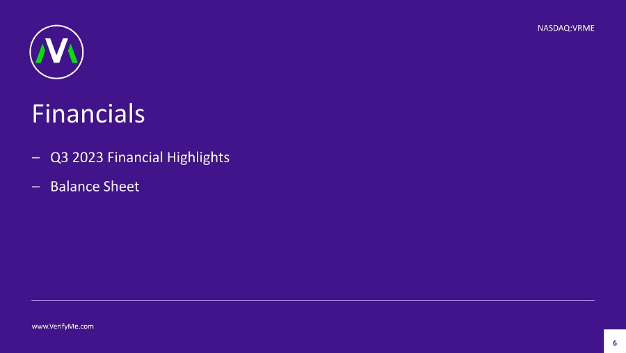 Outlook (1) 1 • Pleased with organic growth and gross margin improvement • Anticipating revenue of approximately $26M and positive adjusted EBITDA for 2023 • Expect double - digit organic growth in 2024 Capital • Pleased to have the participation in the convertible note offering. Feel confident we have the backing for both our organic and strategic growth plans • Renewed revolving Line of Credit with PNC Bank Precision Logistics • Business is tracking with plan • Improved margin profile through operating efficiencies and pursuit of higher value customers. • Continue to see growth opportunities associated servicing the needs of the perishable market and expanding our relationship with the world's largest air freight company 3 2 Strategic Snapshot 5 www.VerifyMe.com NASDAQ:VRME 4 Authentication • Lower revenues in 2023 with existing customers than expected • New strategy gaining momentum • Implemented new ink pricing strategy and we have a growing pipeline • APAC business has been impacted in 2023 by economic and weather conditions. We are seeing our volumes increase and winning new customers • Our technology stack is allowing us to expand our relationships and opportunities in the US market (1) Projections are based on Company estimates as of November 8 , 2023, and are provided solely for illustrative purposes. Actual results may vary. The Company undertakes no obligation to up date this information. A reconciliation of forward - looking Adjusted EBITDA to its nearest GAAP measure, net loss, is unavailable on a forward - looking basis without unreaso nable effort due to the uncertainty of components of the GAAP measure that are indeterminable as of the date of this presentation.