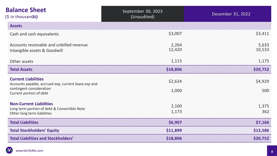 Q3 2023 Financial Highlights Revenue Growth in our premium services in our Precision Logistics segment $5.6M Net Loss Including $0.2M severance ($0.4M) $3.1M Gross Profit GP up by $0.4M Margins improved due to increase in Precision Logistics $2.3M Up 7% YoY Compared to ($0.2)M in 2022 41% compared to 36% in 2022 (1) The term Adjusted EBITDA is a non - GAAP financial measure that the Company believes is useful to investors in evaluating its results. Adjusted EBITDA represents EBITDA (net income (loss) before interest expense, extinguishment of debt, income tax expense (benefit), depreciation and amortization) plus non - cash stock compensation expense, s everance expense, unrealized (loss) gain on equity investment, loss on equity investment, impairment of intangibles, change in fair value of contingent consideration and one - time professional expenses for acquisitions. For a reconciliation of this non - GAAP financial measure to the most comparable GAAP equivalent, net loss, see the Non - GAAP Reconciliation along with related footnotes, in the Appendix to this presentation. NASDAQ:VRME 7 www.VerifyMe.com ($0.9M) $0.2M Adjusted EBITDA Higher margins & more efficient use of resources