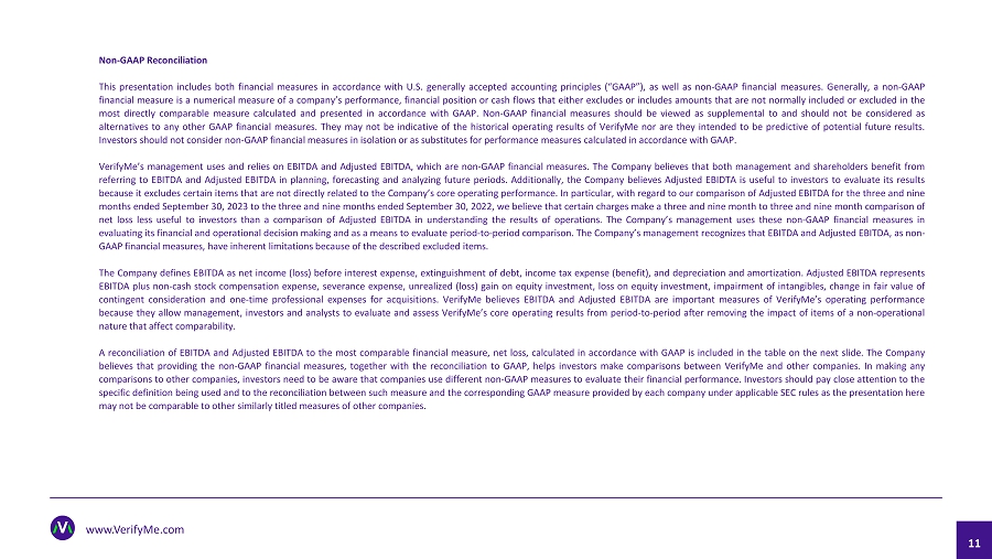This press release includes both financial measures in accordance with U.S. generally accepted accounting principles (“GAAP”), as well as non-GAAP financial measures. Generally, a non-GAAP financial measure is a numerical measure of a company’s performance, financial position or cash flows that either excludes or includes amounts that are not normally included or excluded in the most directly comparable measure calculated and presented in accordance with GAAP. Non-GAAP financial measures should be viewed as supplemental to and should not be considered as alternatives to any other GAAP financial measures. They may not be indicative of the historical operating results of VerifyMe nor are they intended to be predictive of potential future results. Investors should not consider non-GAAP financial measures in isolation or as substitutes for performance measures calculated in accordance with GAAP.