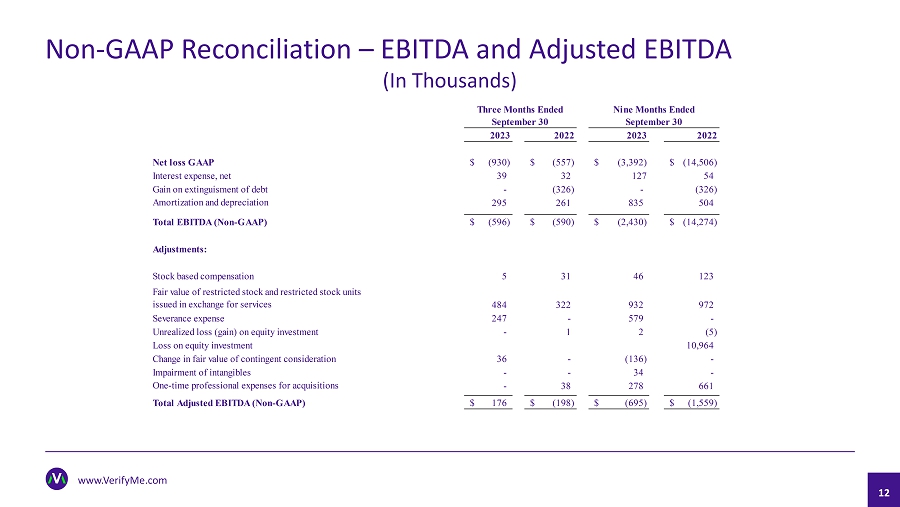 11 www.VerifyMe.com Non - GAAP Reconciliation This presentation includes both financial measures in accordance with U . S . generally accepted accounting principles (“GAAP”), as well as non - GAAP financial measures . Generally, a non - GAAP financial measure is a numerical measure of a company’s performance, financial position or cash flows that either excludes or includes amounts that are not normally included or excluded in the most directly comparable measure calculated and presented in accordance with GAAP . Non - GAAP financial measures should be viewed as supplemental to and should not be considered as alternatives to any other GAAP financial measures . They may not be indicative of the historical operating results of VerifyMe nor are they intended to be predictive of potential future results . Investors should not consider non - GAAP financial measures in isolation or as substitutes for performance measures calculated in accordance with GAAP . VerifyMe’s management uses and relies on EBITDA and Adjusted EBITDA, which are non - GAAP financial measures . The Company believes that both management and shareholders benefit from referring to EBITDA and Adjusted EBITDA in planning, forecasting and analyzing future periods . Additionally, the Company believes Adjusted EBIDTA is useful to investors to evaluate its results because it excludes certain items that are not directly related to the Company’s core operating performance . In particular, with regard to our comparison of Adjusted EBITDA for the three and nine months ended September 30 , 2023 to the three and nine months ended September 30 , 2022 , we believe that certain charges make a three and nine month to three and nine month comparison of net loss less useful to investors than a comparison of Adjusted EBITDA in understanding the results of operations . The Company’s management uses these non - GAAP financial measures in evaluating its financial and operational decision making and as a means to evaluate period - to - period comparison . The Company’s management recognizes that EBITDA and Adjusted EBITDA, as non - GAAP financial measures, have inherent limitations because of the described excluded items . The Company defines EBITDA as net income (loss) before interest expense, extinguishment of debt, income tax expense (benefit), and depreciation and amortization . Adjusted EBITDA represents EBITDA plus non - cash stock compensation expense, severance expense, unrealized (loss) gain on equity investment, loss on equity investment, impairment of intangibles, change in fair value of contingent consideration and one - time professional expenses for acquisitions . VerifyMe believes EBITDA and Adjusted EBITDA are important measures of VerifyMe’s operating performance because they allow management, investors and analysts to evaluate and assess VerifyMe’s core operating results from period - to - period after removing the impact of items of a non - operational nature that affect comparability . A reconciliation of EBITDA and Adjusted EBITDA to the most comparable financial measure, net loss, calculated in accordance with GAAP is included in the table on the next slide . The Company believes that providing the non - GAAP financial measures, together with the reconciliation to GAAP, helps investors make comparisons between VerifyMe and other companies . In making any comparisons to other companies, investors need to be aware that companies use different non - GAAP measures to evaluate their financial performance . Investors should pay close attention to the specific definition being used and to the reconciliation between such measure and the corresponding GAAP measure provided by each company under applicable SEC rules as the presentation here may not be comparable to other similarly titled measures of other companies .