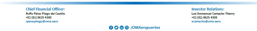 Grupo Aeroportuario del Centro Norte, S.A.B. de C.V., known as OMA, operates 13 international airports in nine states of central and northern Mexico. OMA’s airports serve Monterrey, Mexico’s third largest metropolitan area, the tourist destinations of Acapulco, Mazatlán, and Zihuatanejo, and nine other regional centers and border cities. OMA also operates the NH Collection Hotel inside Terminal 2 of the Mexico City airport and the Hilton Garden Inn at the Monterrey airport. OMA employs over 1,200 persons in order to offer passengers and clients airport and commercial services in facilities. OMA is listed on the Mexican Stock Exchange (OMA) and on the NASDAQ Global Select Market (OMAB). For more information, visit: