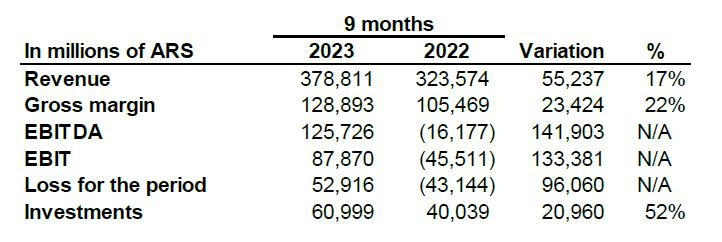 As for Investments, in the January-September 2023 period, they amounted to ARS 60,999 million, which in constant values represents 52% more than the investments recorded in the first nine months of 2022. This indicates that we continued implementing our plan with a direct positive impact on the quality of the service.