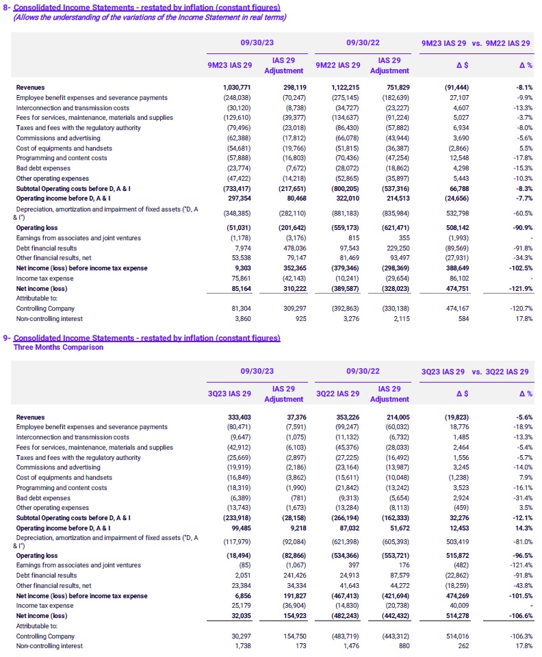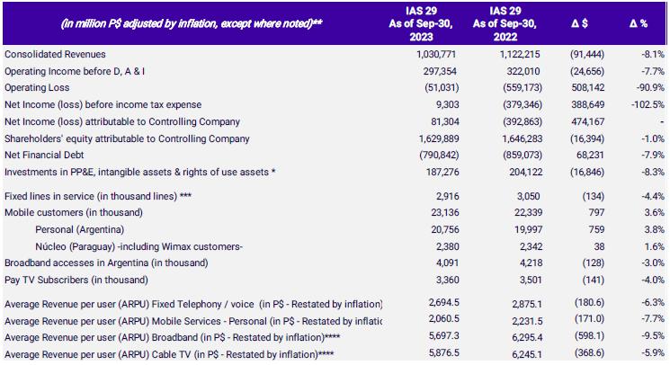 Additionally, broadband ARPU (restated in constant currency as of September 30, 2023) amounted to P$5,687.3 in 9M23 (vs. P$6,295.4 in 9M22). The effect generated by the restatement in terms of the measuring unit as of September 30, 2023, included in the ARPU amounted to approximately P$1,625,7 and P$4,320.1 for the 9M23 and 9M22, respectively.