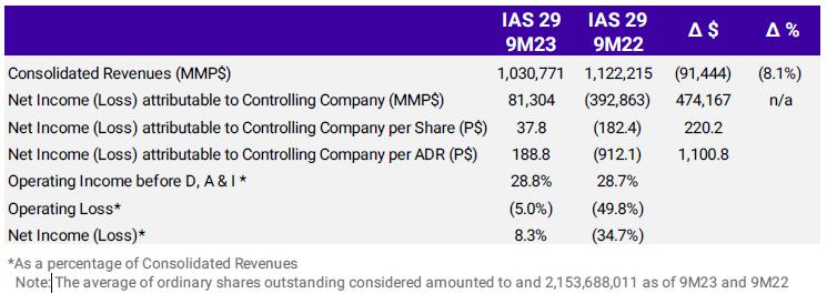 | · | During the 9M23, the Company recorded a net income of P$85,164 million (vs. a loss of P$389,587 million in 9M22). |