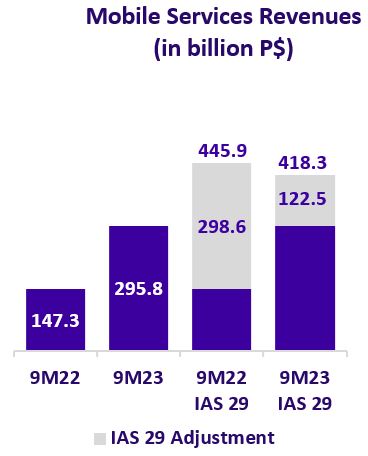 As of September 30, 2023, total mobile subscribers amounted to approximately 20.8 million (+759 thousand vs. 9M22). Throughout the period, there has been a change in customer behavior, resulting in a 10.5% increase in the prepaid subscriber base and a 5.1% decrease in the postpaid subscriber base. As of September 30, 2023, postpaid clients represent 39% of our mobile subscriber base.