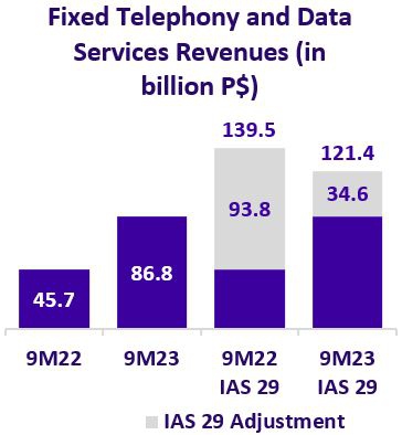 Revenues generated by fixed telephony and data services reached P$121,423 million in 9M23 (-18,053 million or -12.9 % vs. 9M22).