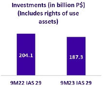 During the 9M23, the Company invested (including rights of use assets) P$187,276 million (-8.3% vs. 9M22). Said investments represented 18.2% of consolidated revenues in 9M23. As of September 30, 2023, investments without including additions for right of use continue to be affected by import restrictions and totaled $147,222 million (-17.5% vs. 9M22).
