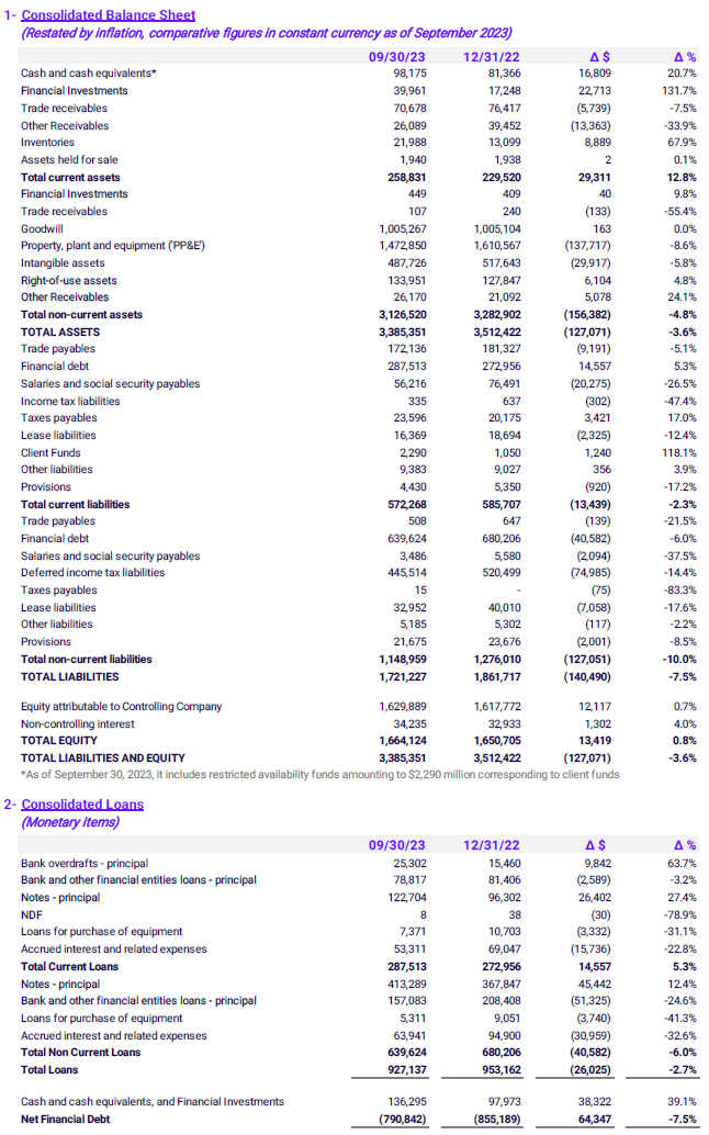 | · | Net Financial Debt amounted to P$790,842 million in 9M23 (-7.9% in constant currency vs. 9M22). |