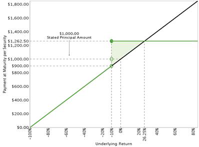 | ▪ | The securities offer the potential for automatic early redemption at a premium following the first valuation date (other than the final valuation date) on which the closing value of the underlying is greater than or equal to the initial underlying value. If the securities are not automatically redeemed prior to maturity, the securities will provide for repayment of the stated principal amount plus a premium at maturity if the final underlying value is greater than or equal to the final barrier value. However, if the securities are not automatically redeemed prior to maturity and the final underlying value is less than the final barrier value, you will lose 1% of the stated principal amount of your securities for every 1% by which the final underlying value is less than the initial underlying value. Although you will have downside exposure to the underlying, you will not receive dividends with respect to the underlying or participate in any appreciation of the underlying. |