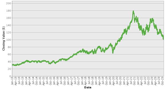 | Agilent Technologies, Inc. – Historical Closing Values January 2, 2013 to November 7, 2023 |
