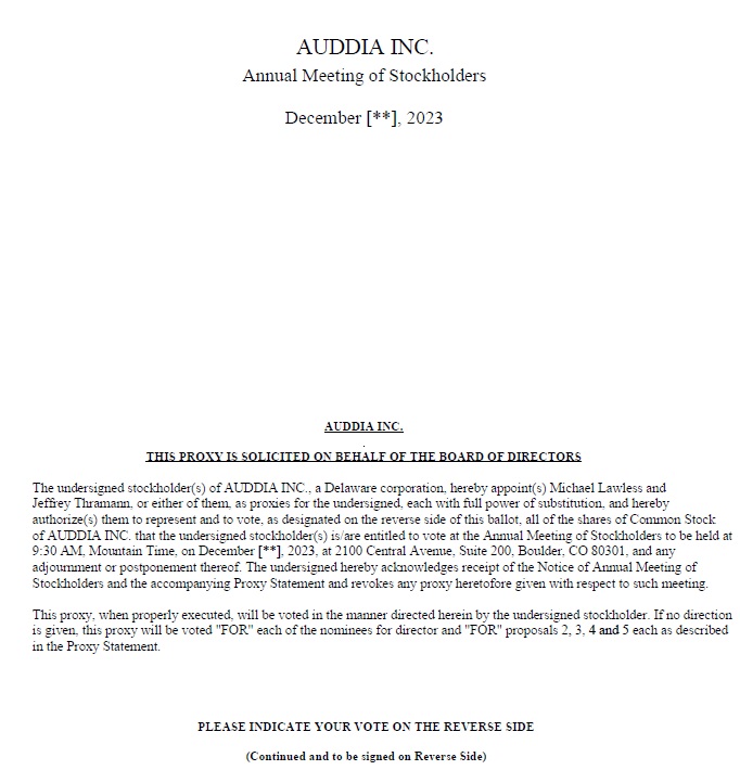 This proxy statement contains information about the 2023 Annual Meeting of Stockholders, or the Annual Meeting, of Auddia Inc., which will be held on December [***], 2023 at 9:30 a.m. Mountain Time. The Annual Meeting will be held at the offices of Auddia Inc., 2100 Central Avenue, Suite 200, Boulder, CO 80301. You may only attend the Annual Meeting in person.
