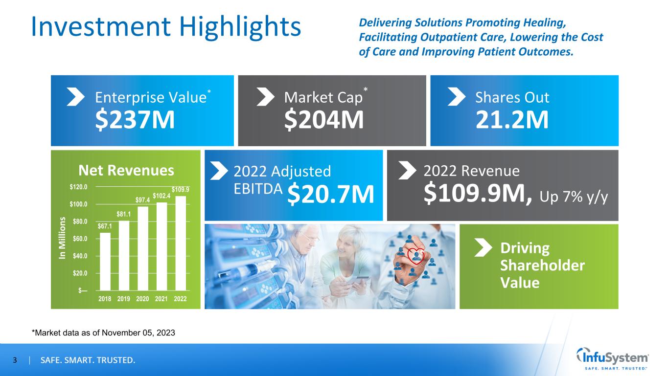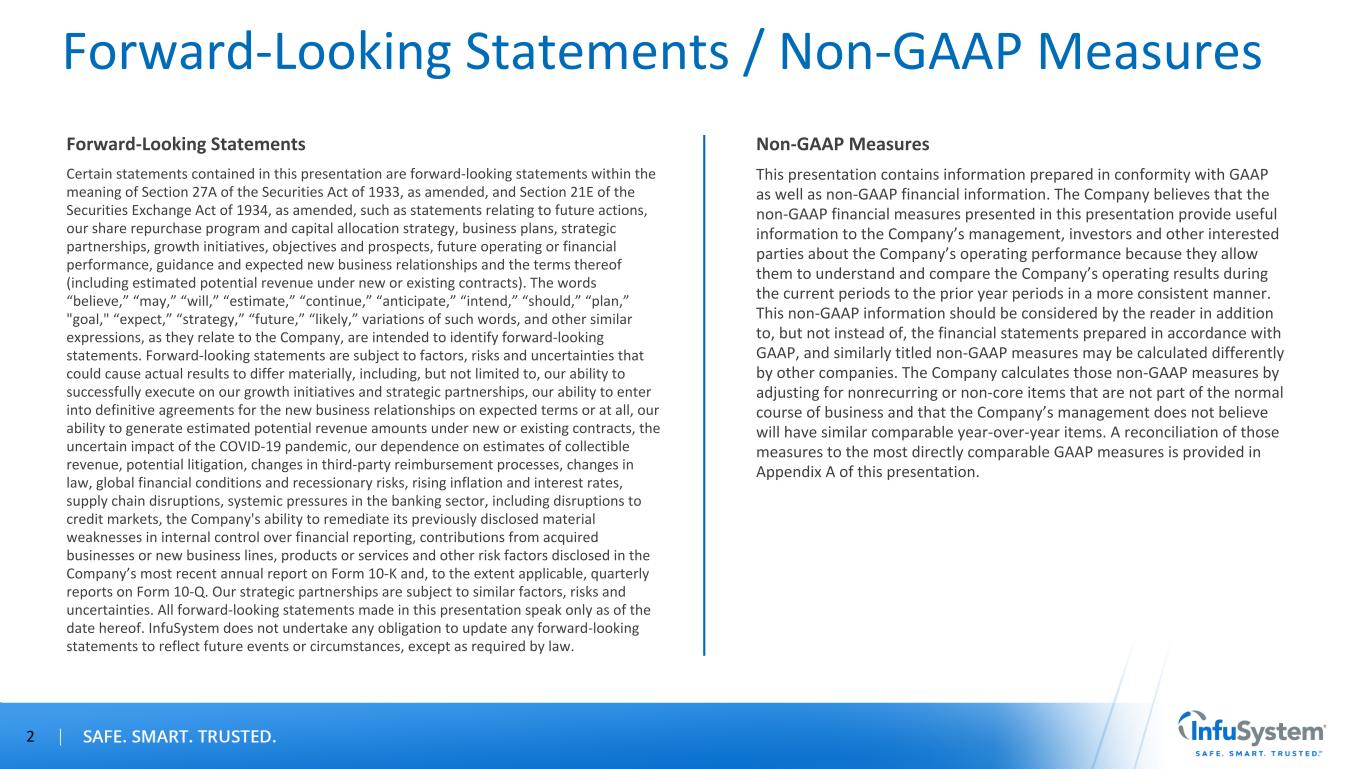 Forward-Looking Statements / Non-GAAP Measures Forward-Looking Statements Certain statements contained in this presentation are forward-looking statements within the meaning of Section 27A of the Securities Act of 1933, as amended, and Section 21E of the Securities Exchange Act of 1934, as amended, such as statements relating to future actions, our share repurchase program and capital allocation strategy, business plans, strategic partnerships, growth initiatives, objectives and prospects, future operating or financial performance, guidance and expected new business relationships and the terms thereof (including estimated potential revenue under new or existing contracts). The words “believe,” “may,” “will,” “estimate,” “continue,” “anticipate,” “intend,” “should,” “plan,” "goal," “expect,” “strategy,” “future,” “likely,” variations of such words, and other similar expressions, as they relate to the Company, are intended to identify forward-looking statements. Forward-looking statements are subject to factors, risks and uncertainties that could cause actual results to differ materially, including, but not limited to, our ability to successfully execute on our growth initiatives and strategic partnerships, our ability to enter into definitive agreements for the new business relationships on expected terms or at all, our ability to generate estimated potential revenue amounts under new or existing contracts, the uncertain impact of the COVID-19 pandemic, our dependence on estimates of collectible revenue, potential litigation, changes in third-party reimbursement processes, changes in law, global financial conditions and recessionary risks, rising inflation and interest rates, supply chain disruptions, systemic pressures in the banking sector, including disruptions to credit markets, the Company's ability to remediate its previously disclosed material weaknesses in internal control over financial reporting, contributions from acquired businesses or new business lines, products or services and other risk factors disclosed in the Company’s most recent annual report on Form 10-K and, to the extent applicable, quarterly reports on Form 10-Q. Our strategic partnerships are subject to similar factors, risks and uncertainties. All forward-looking statements made in this presentation speak only as of the date hereof. InfuSystem does not undertake any obligation to update any forward-looking statements to reflect future events or circumstances, except as required by law. Non-GAAP Measures This presentation contains information prepared in conformity with GAAP as well as non-GAAP financial information. The Company believes that the non-GAAP financial measures presented in this presentation provide useful information to the Company’s management, investors and other interested parties about the Company’s operating performance because they allow them to understand and compare the Company’s operating results during the current periods to the prior year periods in a more consistent manner. This non-GAAP information should be considered by the reader in addition to, but not instead of, the financial statements prepared in accordance with GAAP, and similarly titled non-GAAP measures may be calculated differently by other companies. The Company calculates those non-GAAP measures by adjusting for nonrecurring or non-core items that are not part of the normal course of business and that the Company’s management does not believe will have similar comparable year-over-year items. A reconciliation of those measures to the most directly comparable GAAP measures is provided in Appendix A of this presentation. 2