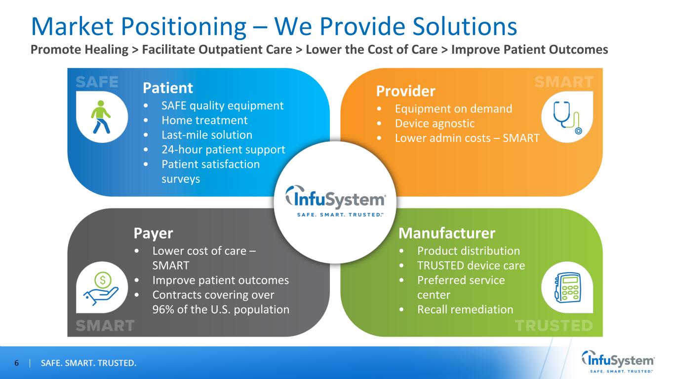 *Source: U.S. News & World Report, Best Hospitals, July 2022 5 Business Highlights A leading provider of medical equipment and patient services powered by a 100K+ device fleet in the U.S. and Canada Over three decades of experience, built on existing Oncology therapy model and now rapidly expanding into multiple therapies National scale, serving 18 out of 20 top-ranked hospital systems nationwide* Participating in-network provider in more than 800 health insurance networks covering over 96% of the U.S. population, serving over 2,450 sites of care Serving nearly 5,000 customer locations Seven major service areas in the U.S. and Canada with more than 450 employees