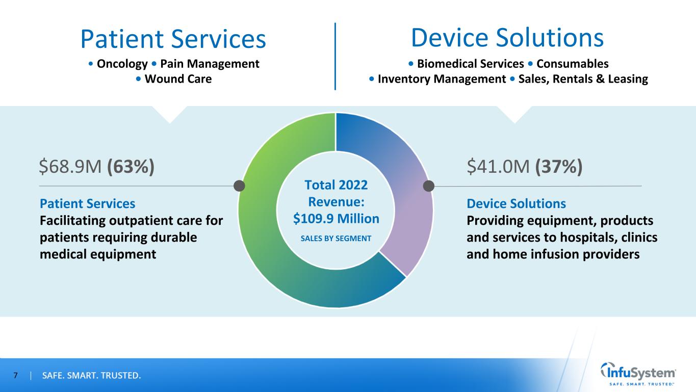 • Safe quality equipment • Home treatment • Equipment on demand • Lower admin costs - Smart • Product distribution • Trusted device care • Lower cost of care - Smart • Improved outcomes 6 Market Positioning – We Provide Solutions Promote Healing > Facilitate Outpatient Care > Lower the Cost of Care > Improve Patient Outcomes Patient • SAFE quality equipment • Home treatment • Last-mile solution • 24-hour patient support • Patient satisfaction surveys Manufacturer • Product distribution RUSTED device care • Preferred service center • Recall remediation Payer • Lower cost of care – SMART • Improve patient outcomes • Contracts covering over 96% of the U.S. population Provider • Equipment on demand • Device agnostic • Lower admin costs – SMART