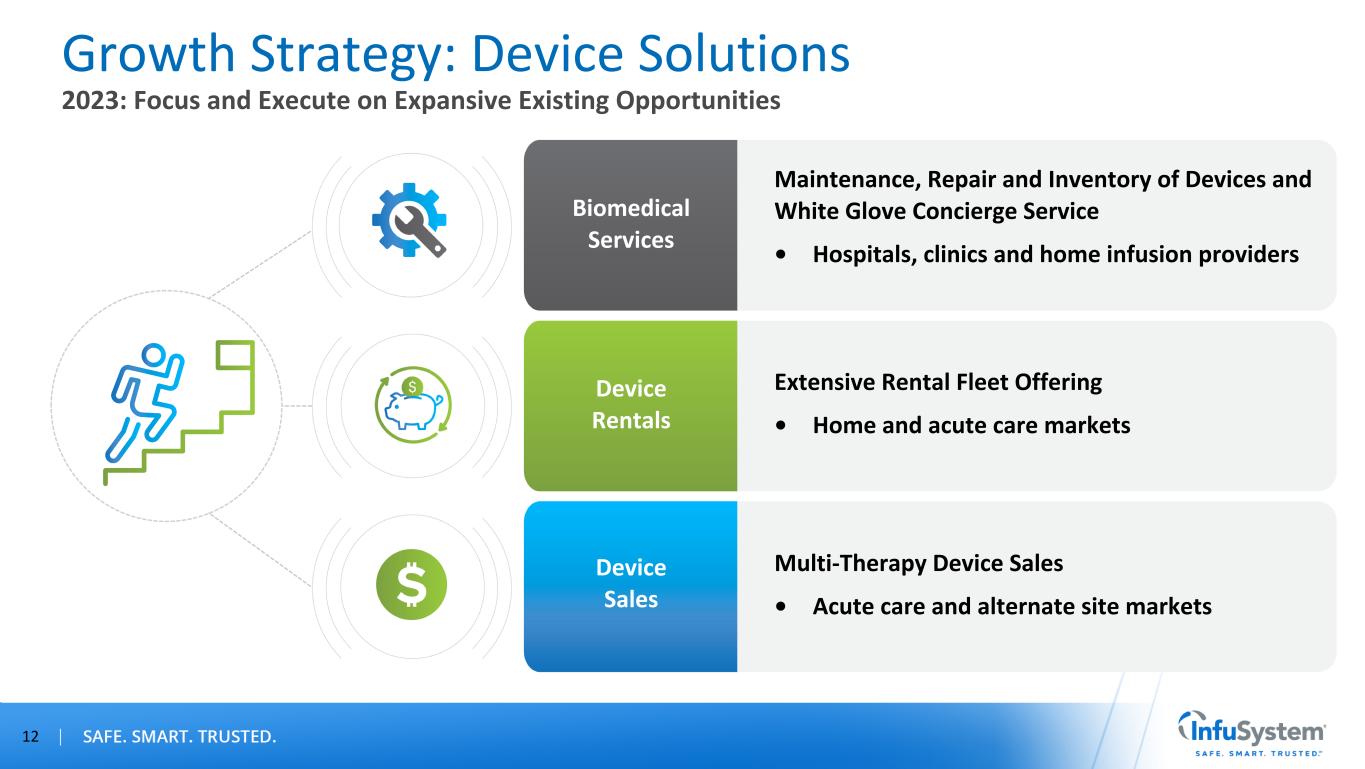 Medical Device Sales, Rentals & Leasing Consumable Sales Device Repair & Maintenance Device Solutions Traditional Medical Distribution, Direct Payer Model INFU Is Paid Directly by the Hospital/Clinic/Home Care Provider Trusted Device & Service Provider Inventory & Tracking • Device Solutions (Core Business) Is Stable and Growing • Growth Opportunity Is Biomedical Services 11