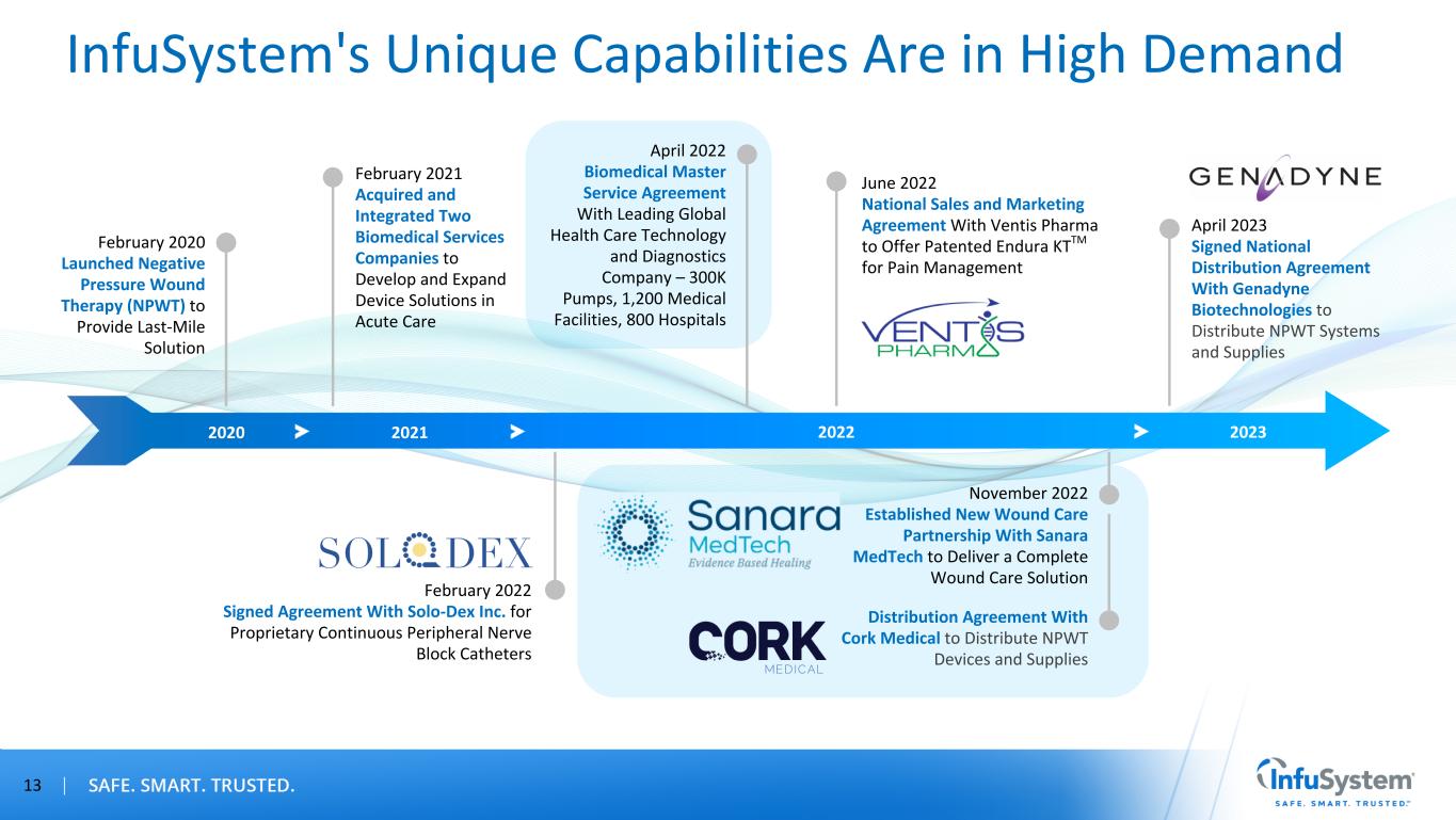 Growth Strategy: Device Solutions 2023: Focus and Execute on Expansive Existing Opportunities Biomedical Services Maintenance, Repair and Inventory of Devices and White Glove Concierge Service • Hospitals, clinics and home infusion providers Device Rentals Extensive Rental Fleet Offering • Home and acute care markets Device Sales Multi-Therapy Device Sales • Acute care and alternate site markets 12