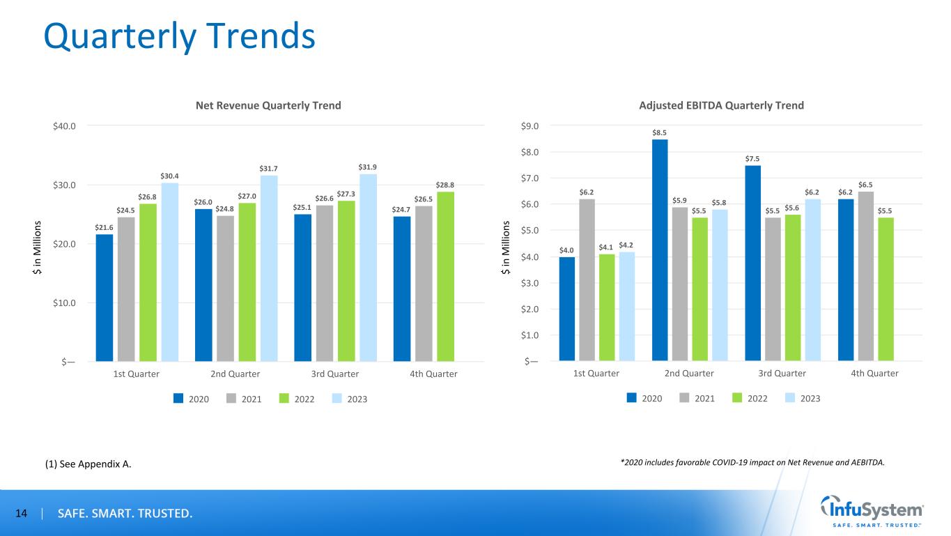 InfuSystem's Unique Capabilities Are in High Demand February 2021 Acquired and Integrated Two Biomedical Services Companies to Develop and Expand Device Solutions in Acute Care February 2022 Signed Agreement With Solo-Dex Inc. for Proprietary Continuous Peripheral Nerve Block Catheters April 2022 Biomedical Master Service Agreement With Leading Global Health Care Technology and Diagnostics Company – 300K Pumps, 1,200 Medical Facilities, 800 Hospitals June 2022 National Sales and Marketing Agreement With Ventis Pharma to Offer Patented Endura KTTM for Pain Management 2021 2022 November 2022 Established New Wound Care Partnership With Sanara MedTech to Deliver a Complete Wound Care Solution Distribution Agreement With Cork Medical to Distribute NPWT Devices and Supplies 2023 April 2023 Signed National Distribution Agreement With Genadyne Biotechnologies to Distribute NPWT Systems and Supplies 13 February 2020 Launched Negative Pressure Wound Therapy (NPWT) to Provide Last-Mile Solution 2020